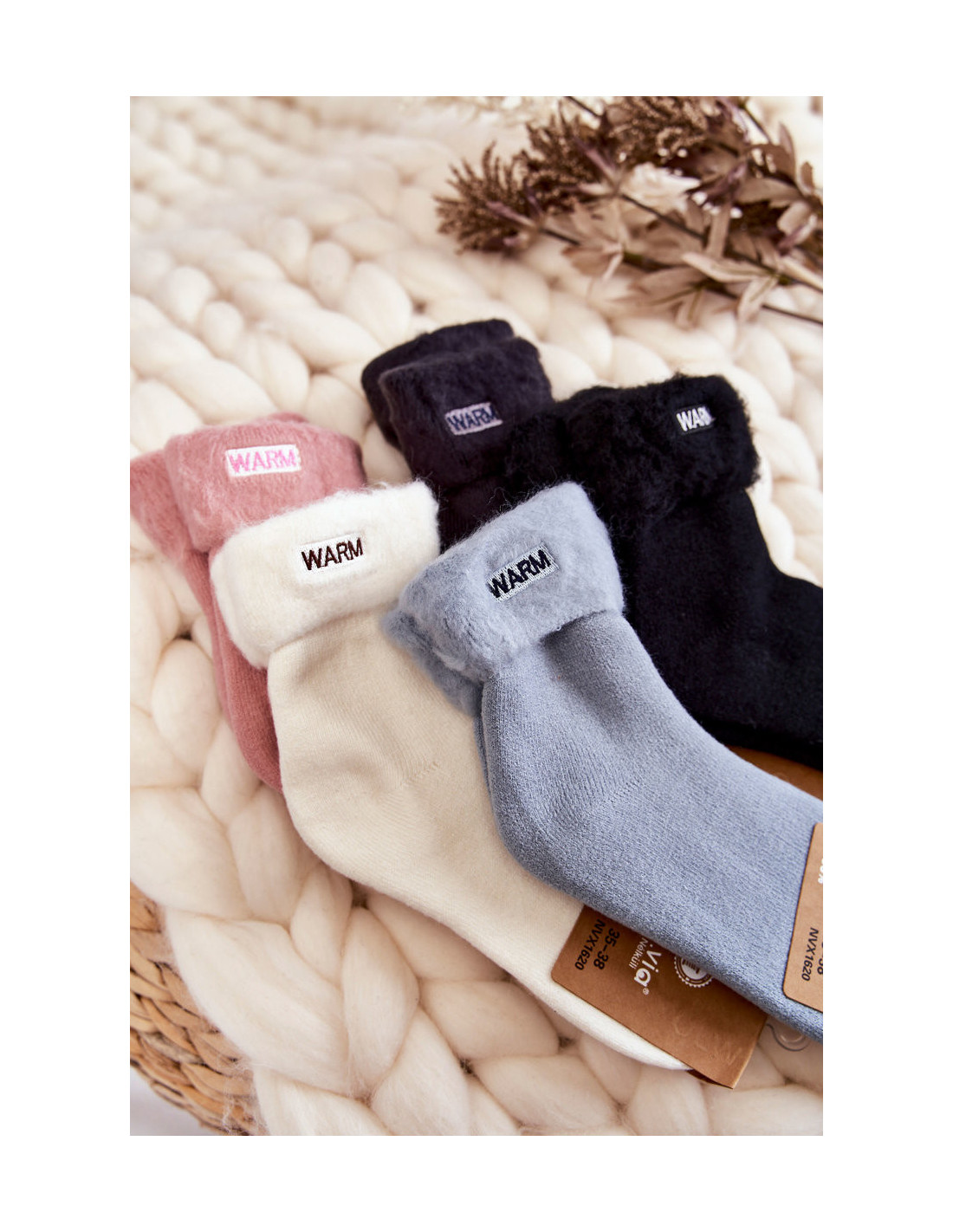 Dviejų dydžių grupių medvilninės kojinės puikiai tinka visiems, kurie vertina šilumą ir komfortą šaltesnėmis dienomis. Jie turi izoliaciją švelnaus kailio pavidalu. Ant kojinių šono yra dekoratyvinis užrašas.