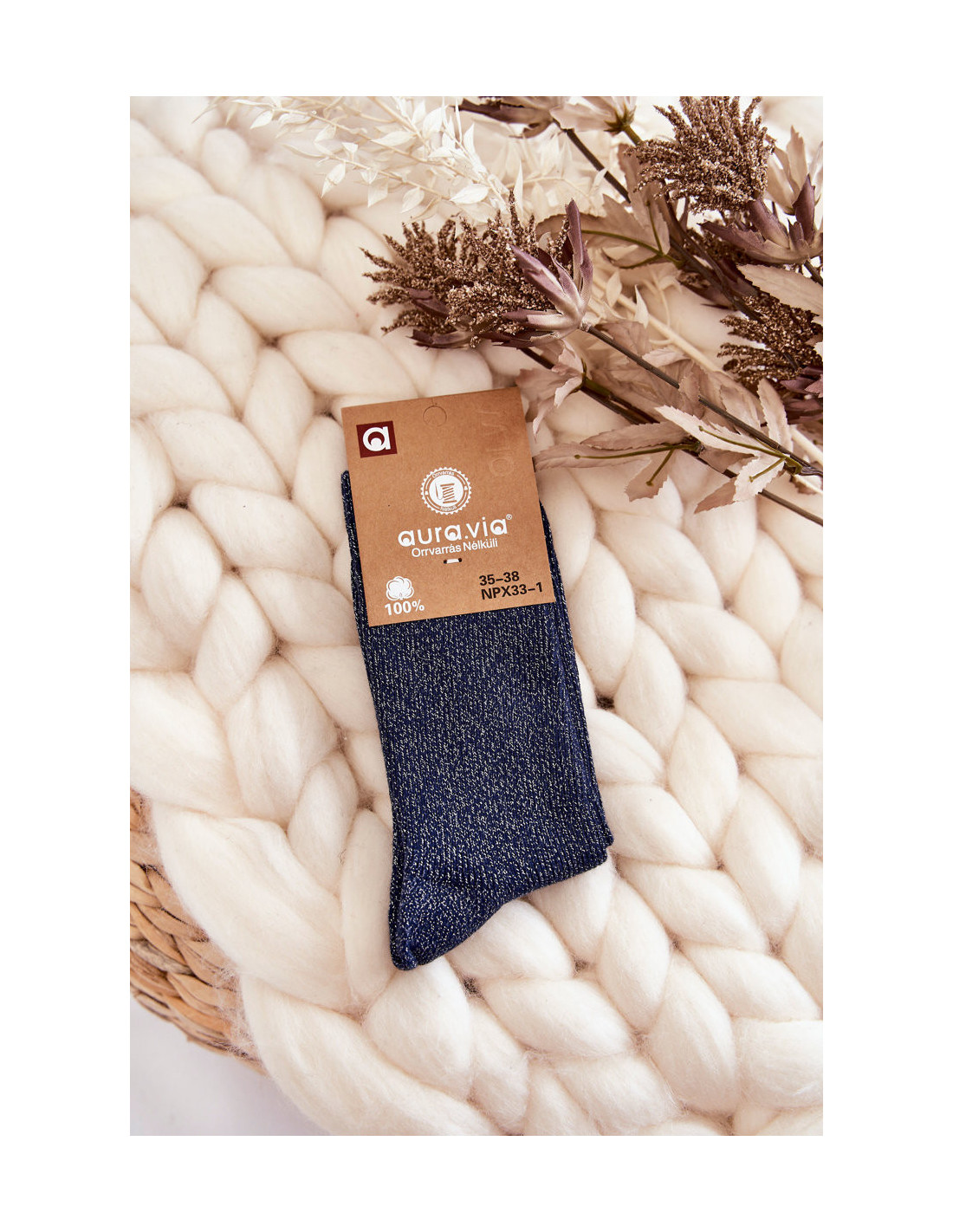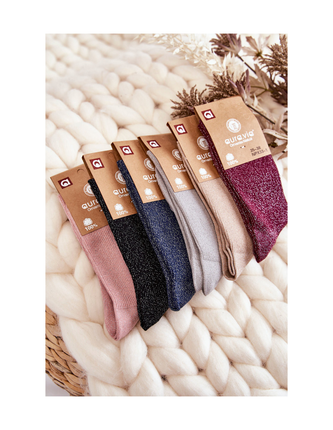 Madingos moteriškos kojinės pagamintos iš medvilninio audinio su lureksu, ty metaliniu siūlu. Šios kojinės yra be slėgio. Modelis šiek tiek briaunotas, virš kulkšnies. Šios kojinės puikiai tinka kasdieniam stiliui prie batų. Šis modelis tikrai turėtų būti jūsų garderobe!