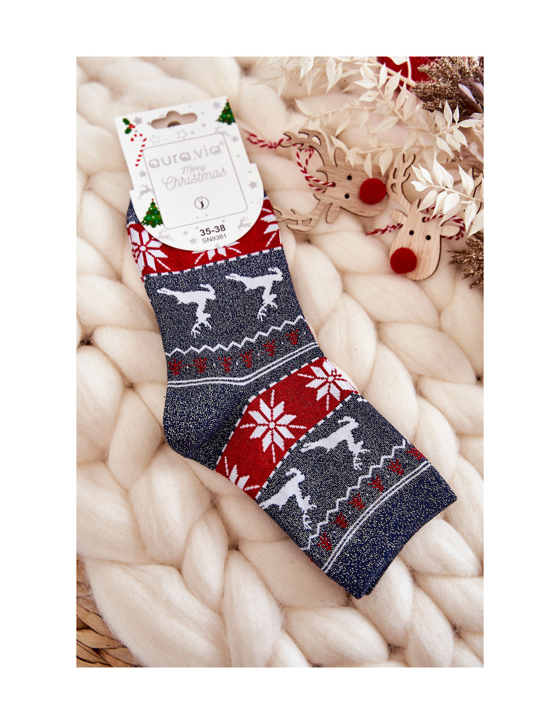 Nuostabios moteriškos kojinės pagamintos iš patvaraus medvilninio audinio. Dekoruota kalėdiniais raštais ir lureksu, ty metalizuotais siūlais. Kojinės turi subtilų briauną, leidžiančią tinkamai prisitaikyti prie kojų pločio. Šis modelis taip pat bus puiki dovana Kalėdų proga!
