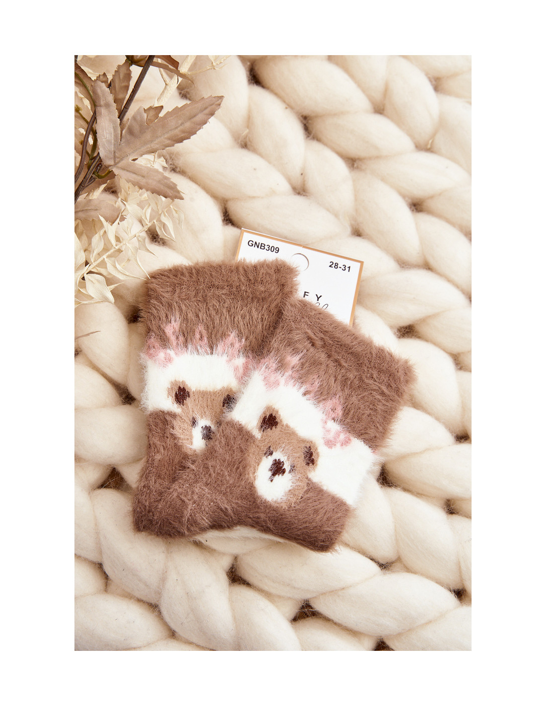 Vaikiškos kailinės kojinės su meškiuku, rudos ir baltos spalvos