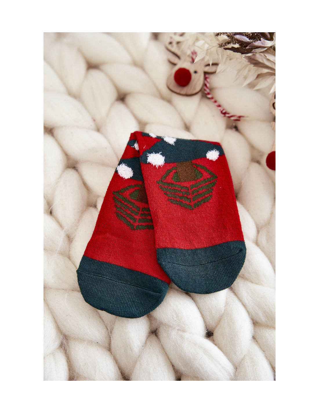 Gražios vaikiškos kojinės su kalėdiniais raštais tikrai patiks jūsų vaikui! Pagaminta iš aukštos kokybės medvilnės. Jie turi audinį, kuris puikiai atitiks vaiko kojos plotį. Be to, jie turi mielas ausis. Šios kojinės puikiai tinka ir kaip dovanų aksesuaras!