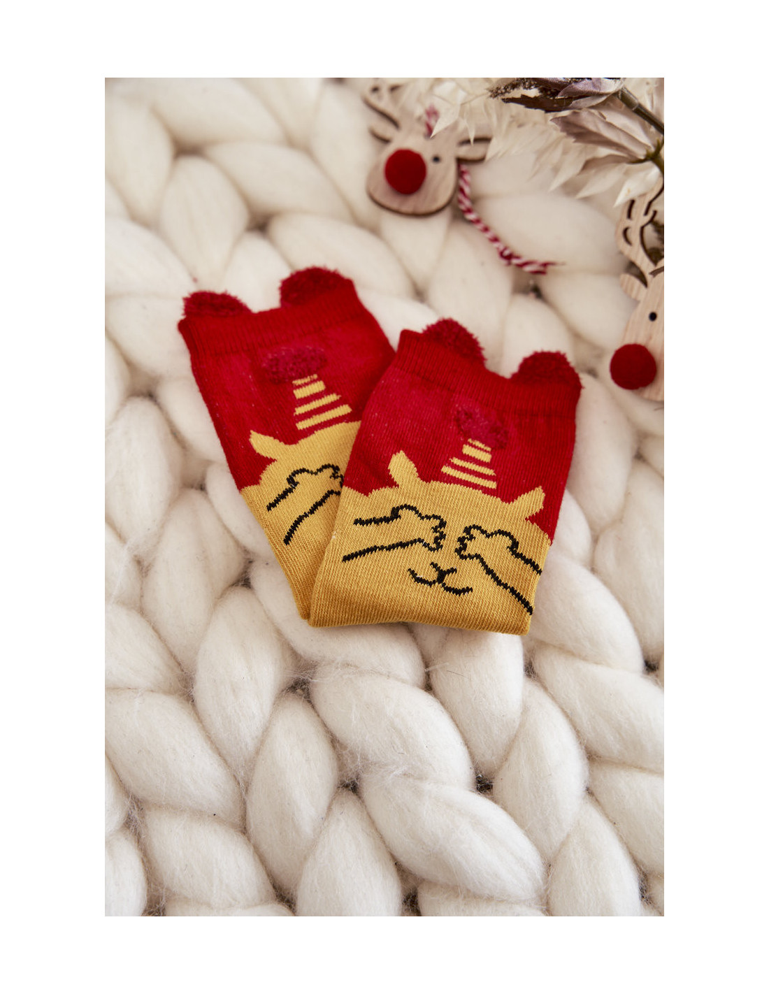 Gražios vaikiškos kojinės su kalėdiniais raštais tikrai patiks jūsų vaikui! Pagaminta iš aukštos kokybės medvilnės. Jie turi audinį, kuris puikiai atitiks vaiko kojos plotį. Be to, jie turi mielas ausis. Šios kojinės puikiai tinka ir kaip dovanų aksesuaras!