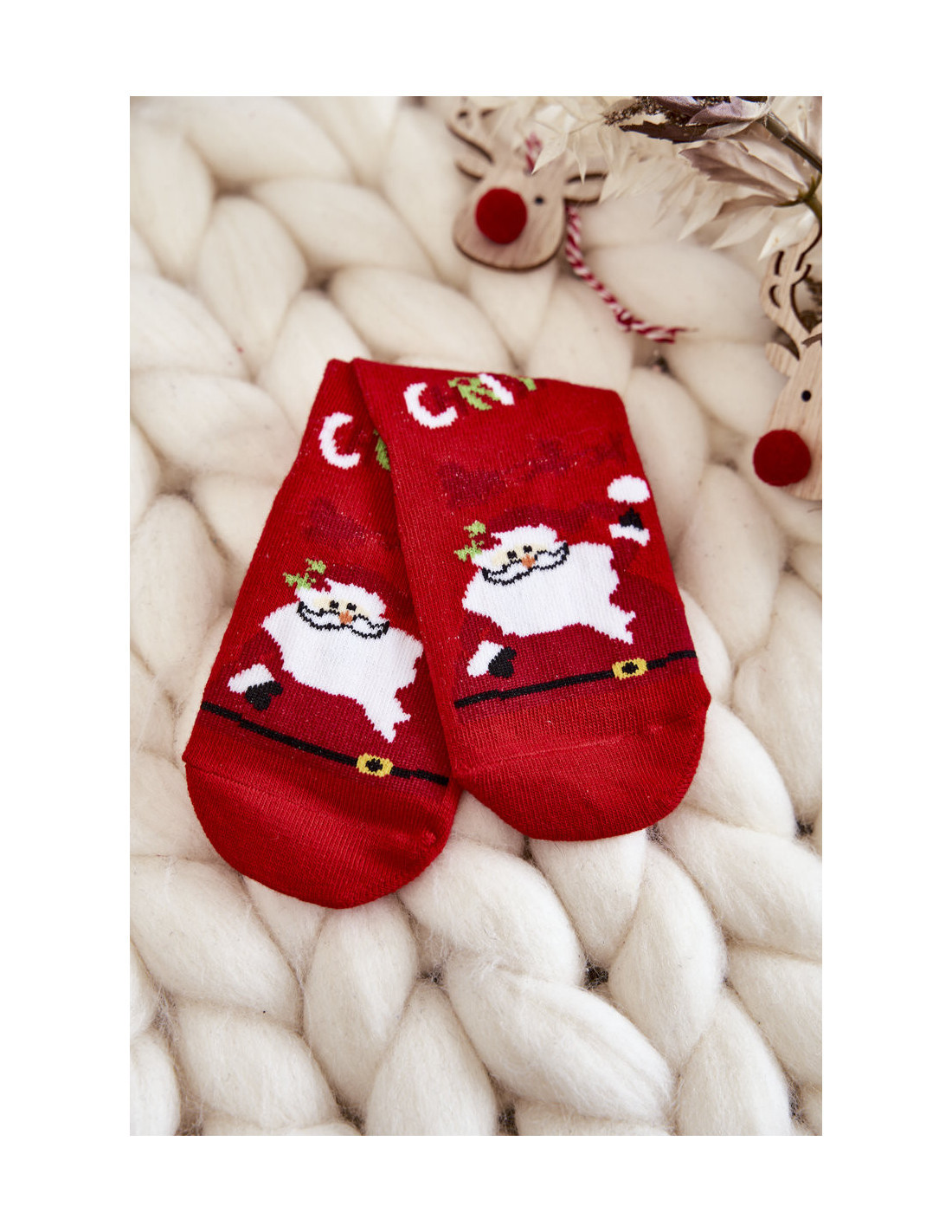 Gražios vaikiškos kojinės su kalėdiniais raštais tikrai patiks jūsų vaikui! Pagaminta iš aukštos kokybės medvilnės. Jie turi audinį, kuris puikiai atitiks vaiko kojos plotį. Be to, jie turi mielas ausis. Šios kojinės puikiai tinka ir kaip dovanų aksesuaras!