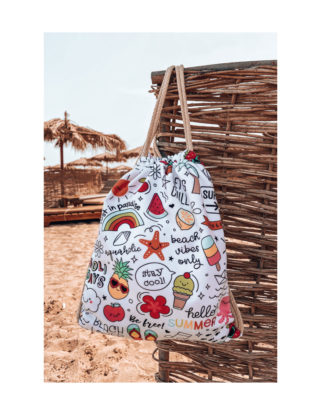 3in1 paplūdimio kuprinė. Produktas lengvas ir malonus liesti. Krepšys turi dvigubas austas rankenas ir virvelę viršuje. Kuprinėje yra papildomas rankšluostis, kuris puikiai tiks atostogoms ar atostogoms smėlio paplūdimyje. Labai funkcionalus ir lengvai surenkamas. Sudėtis: 65% poliesteris, 35% medvilnė.