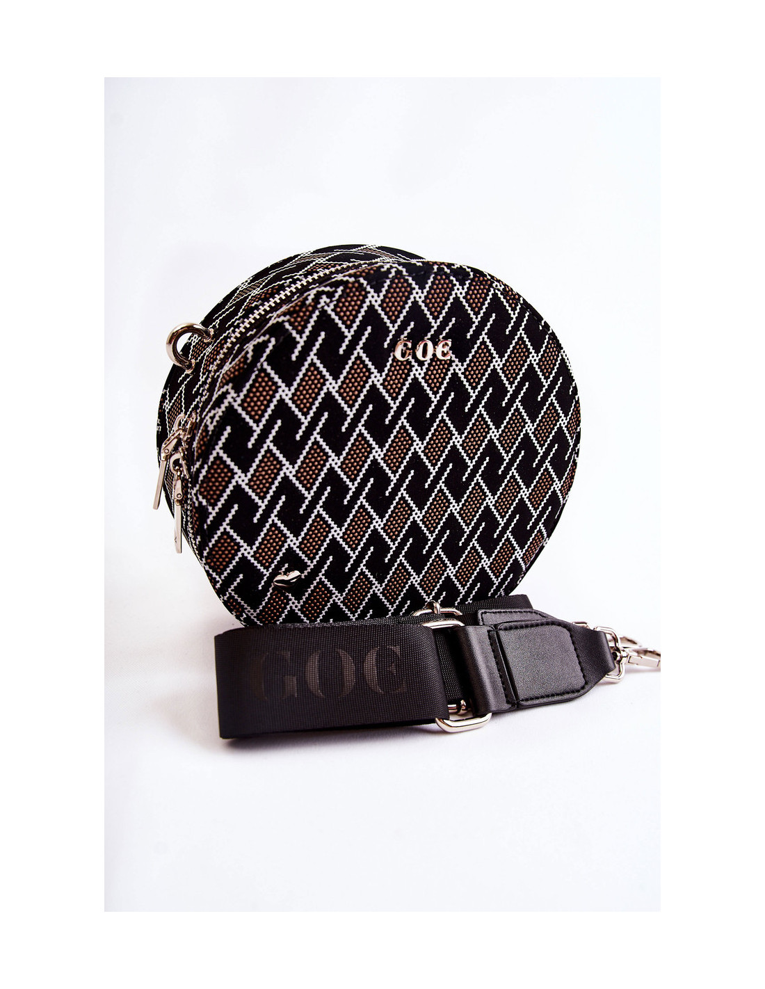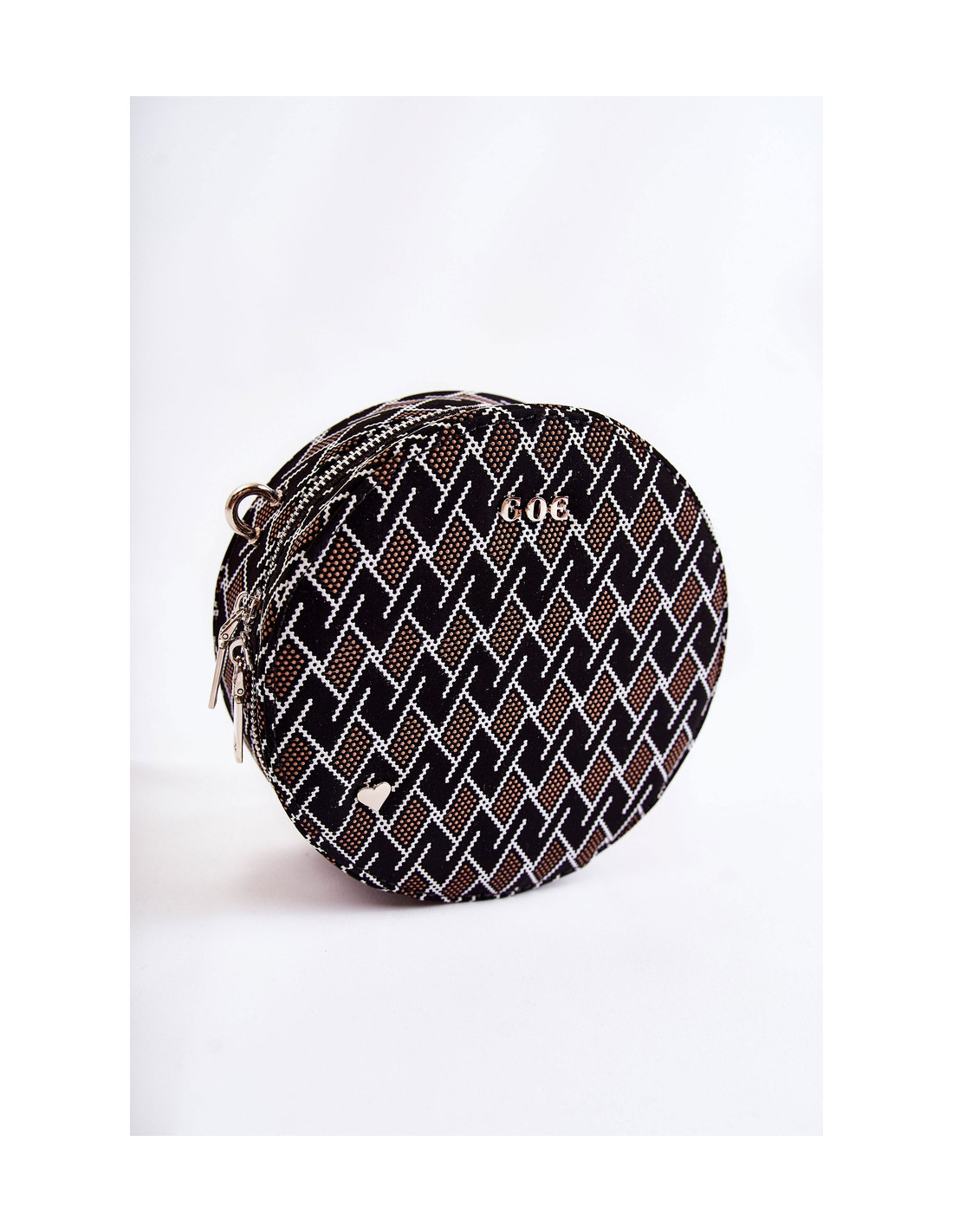 Graži rankinė – GOE prekės ženklo bagažinė! Pagaminta iš aukštos kokybės medžiagos. Priekyje yra GOE prekės ženklo logotipas ir dekoratyvinė emblema širdelės pavidalu. Krepšys turi vieną skyrių, užsegamą užtrauktuku. Viduryje viena atvira kišenė ir viena užsegama užtrauktuku. Pamušalas iš audinio su dekoratyviniu raštu. Krepšys turi vieną reguliuojamą, nuimamą dirželį.