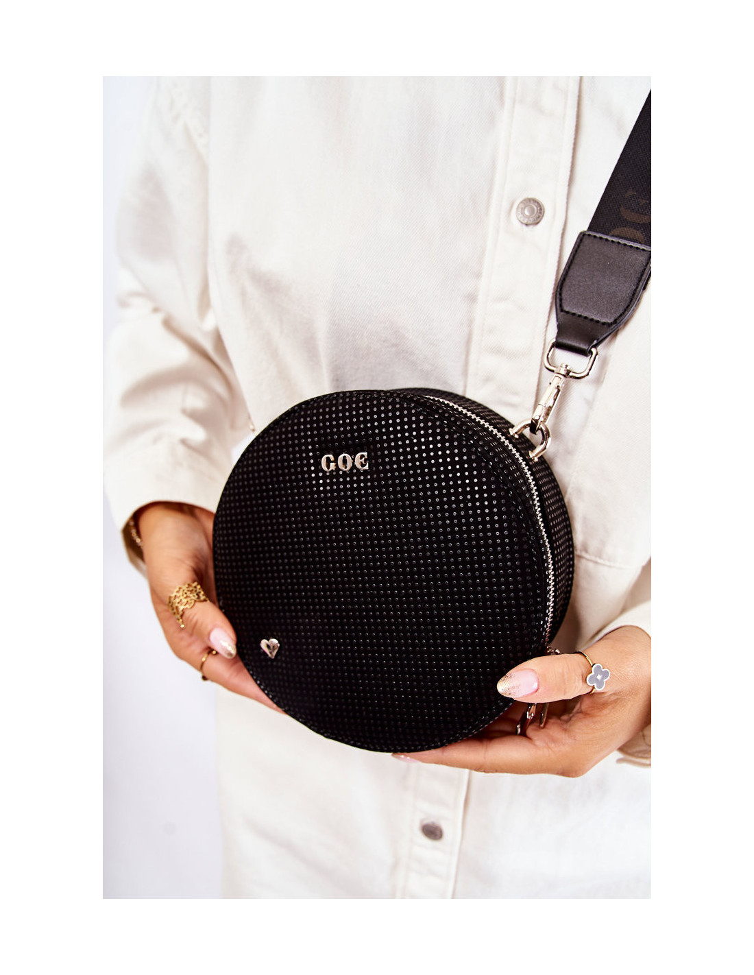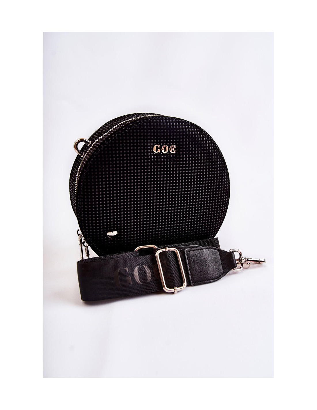 Graži rankinė – GOE prekės ženklo bagažinė! Pagaminta iš aukštos kokybės medžiagos. Priekyje yra GOE prekės ženklo logotipas ir dekoratyvinė emblema širdelės pavidalu. Krepšys turi vieną skyrių, užsegamą užtrauktuku. Viduryje viena atvira kišenė ir viena užsegama užtrauktuku. Pamušalas iš audinio su dekoratyviniu raštu. Krepšys turi vieną reguliuojamą, nuimamą dirželį.