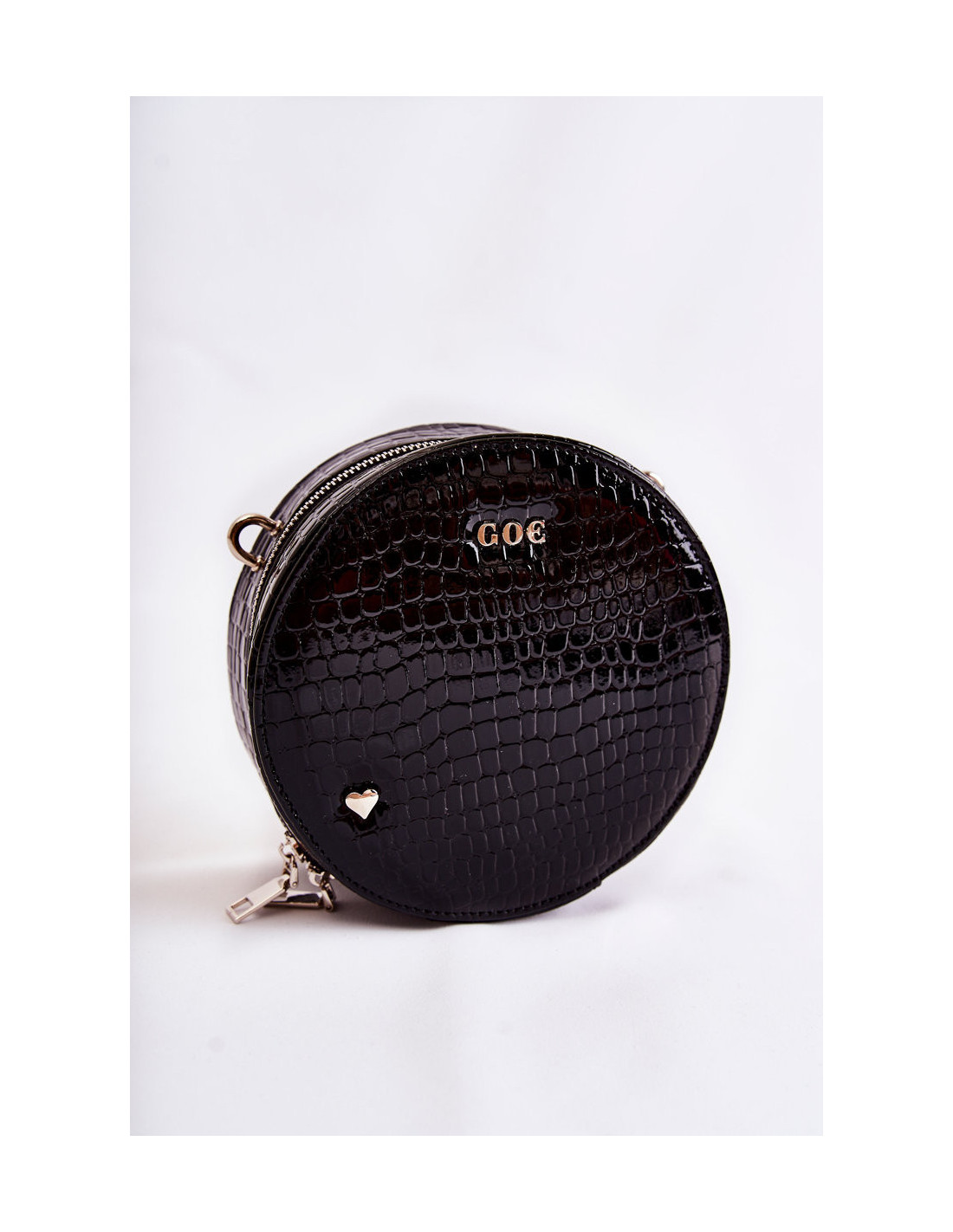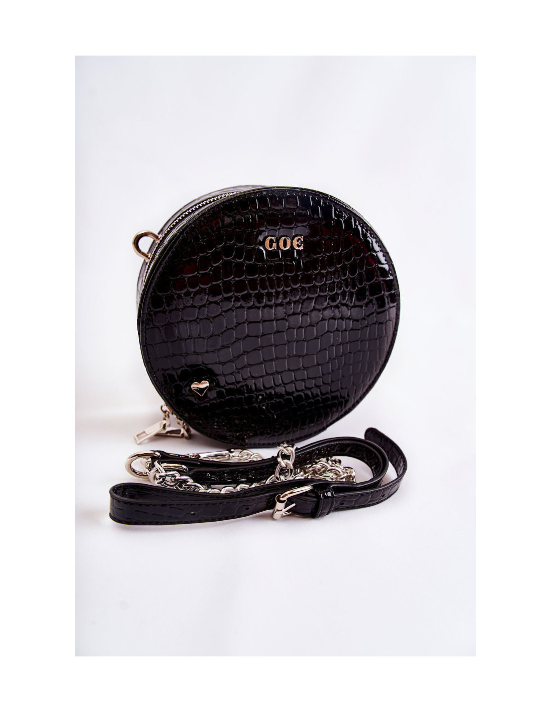 Graži rankinė – GOE prekės ženklo bagažinė! Pagaminta iš aukštos kokybės medžiagos. Priekyje yra GOE prekės ženklo logotipas ir dekoratyvinė emblema širdelės pavidalu. Krepšys turi vieną skyrių, užsegamą užtrauktuku. Viduryje viena atvira kišenė ir viena užsegama užtrauktuku. Pamušalas iš audinio su dekoratyviniu raštu. Krepšys turi vieną reguliuojamą, nuimamą dirželį.