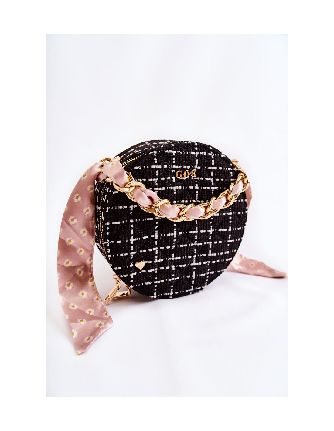 Madinga GOE prekės ženklo bagažinės formos rankinė! Pagaminta iš kokybiškos medžiagos, papildomai dygsniuota. Priekyje yra GOE prekės ženklo logotipas ir dekoratyvinė emblema širdelės pavidalu. Krepšys turi vieną skyrių, užsegamą užtrauktuku. Viduje yra viena atvira kišenė, viena užsegama užtrauktuku. Pamušalas iš audinio su dekoratyviniu raštu. Krepšys turi vieną reguliuojamą, nuimamą dirželį. Be to, maišelyje yra grandinėlė, supinta juostele, kurią galima nuimti.