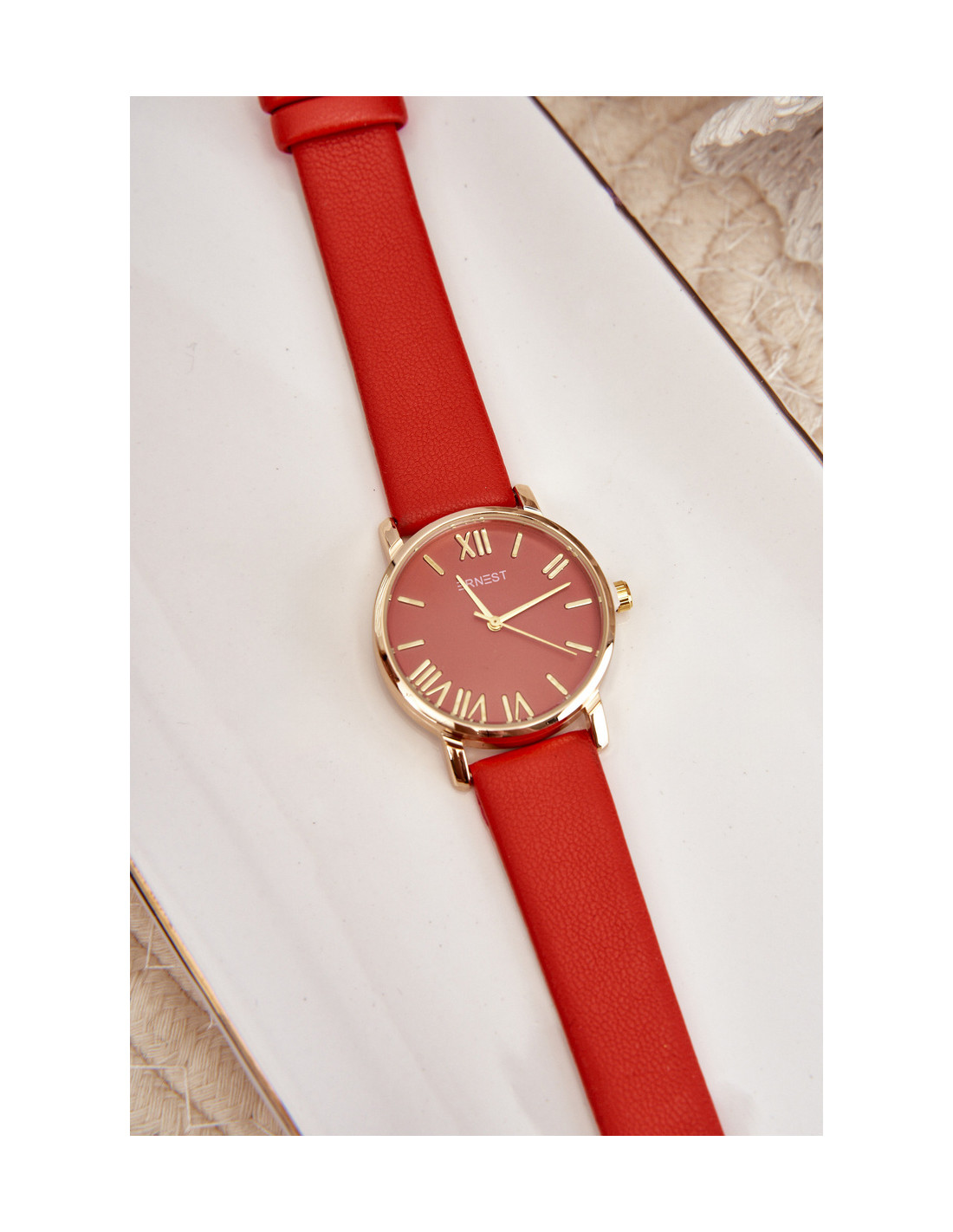 Ernestas moteriškas laikrodis. Diržas iš eko odos. Dėl paprastos, bet unikalios šio laikrodžio formos jis yra puikus aksesuaras tiek kasdienai, tiek iškilmingesnėms progoms. Dėl savo universalumo ir elegancijos jis visada bus subtilus bet kokios aprangos papildymas.