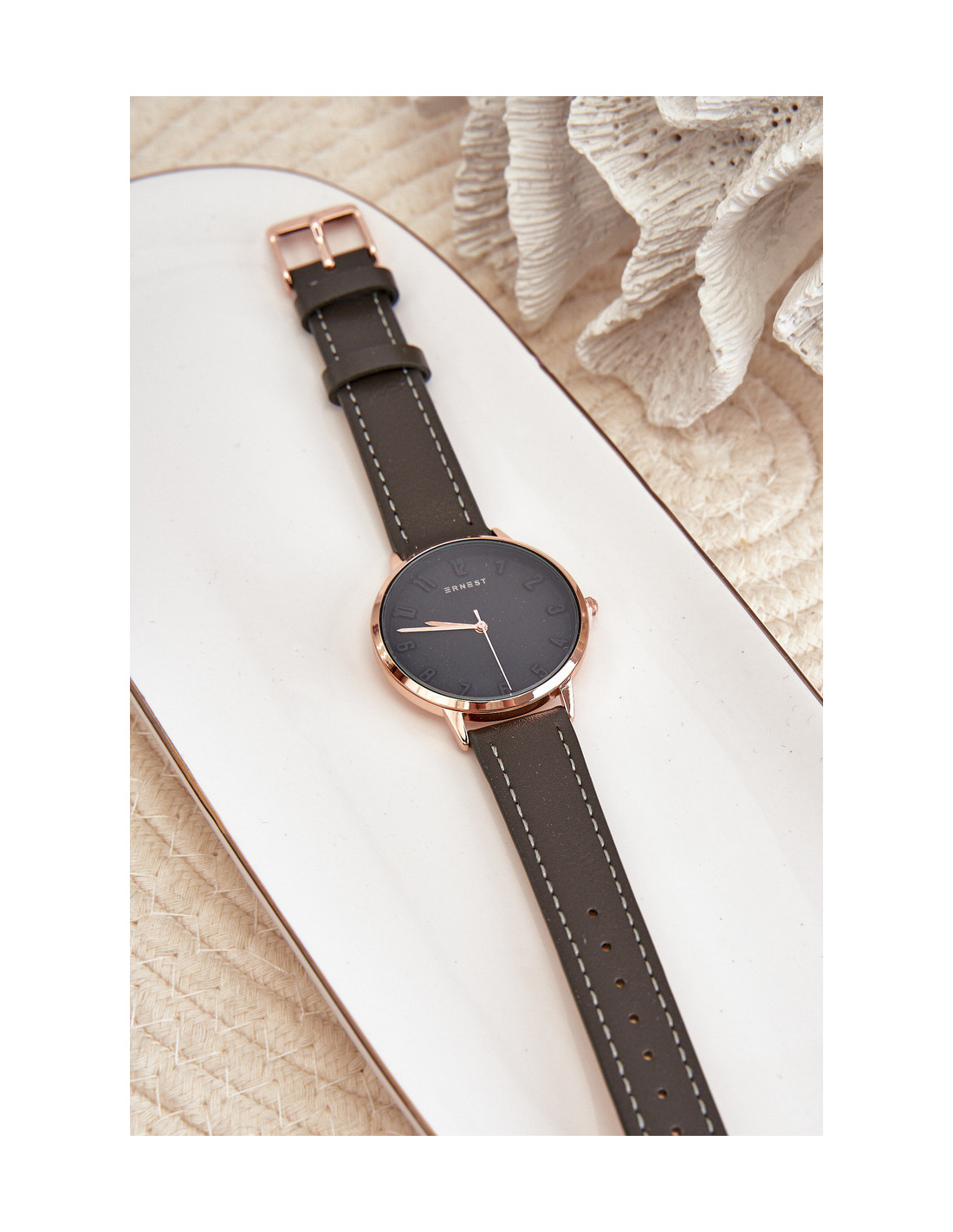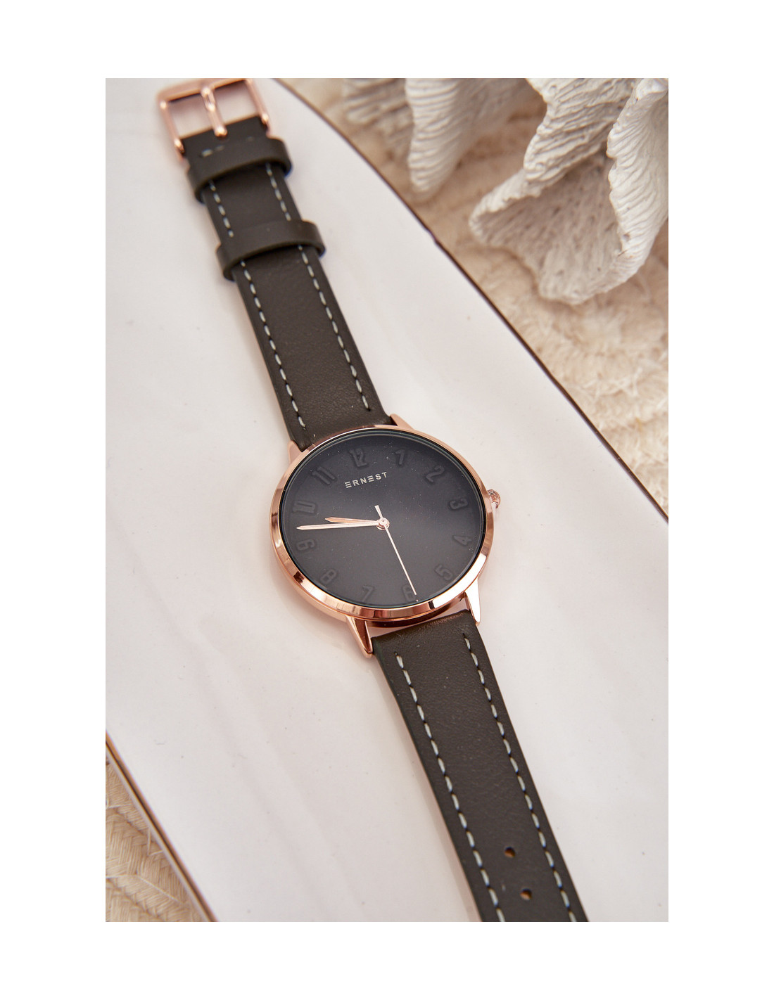 Moteriškas laikrodis Ernest – tai modelis kiekvienai moteriai, vertinančiai eleganciją ir madingą išvaizdą. Šis laikrodis turi reguliuojamą apyrankę iš natūralios odos. Užsegama sagtimi. Didelis ciferblatas laikrodžio apyrankės šešėlyje. Pagaminta iš nerūdijančio plieno. Be nikelio. Jūs tikrai turėtumėte jį turėti savo prieduose!