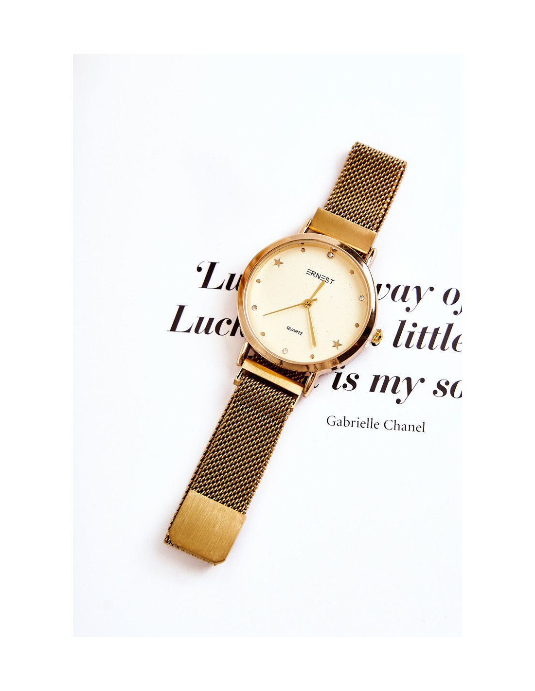 Unikalus ERNEST laikrodis, pagamintas iš nerūdijančio plieno. Laikrodis be nikelio. Turi magnetu užsegamą apyrankę, kurios dėka ją puikiai priderinsite prie rankos pločio. Ciferblate yra kalnų krištolas, žvaigždės ir subtilus blizgesys. Puikus modelis, kurį turėtumėte turėti!