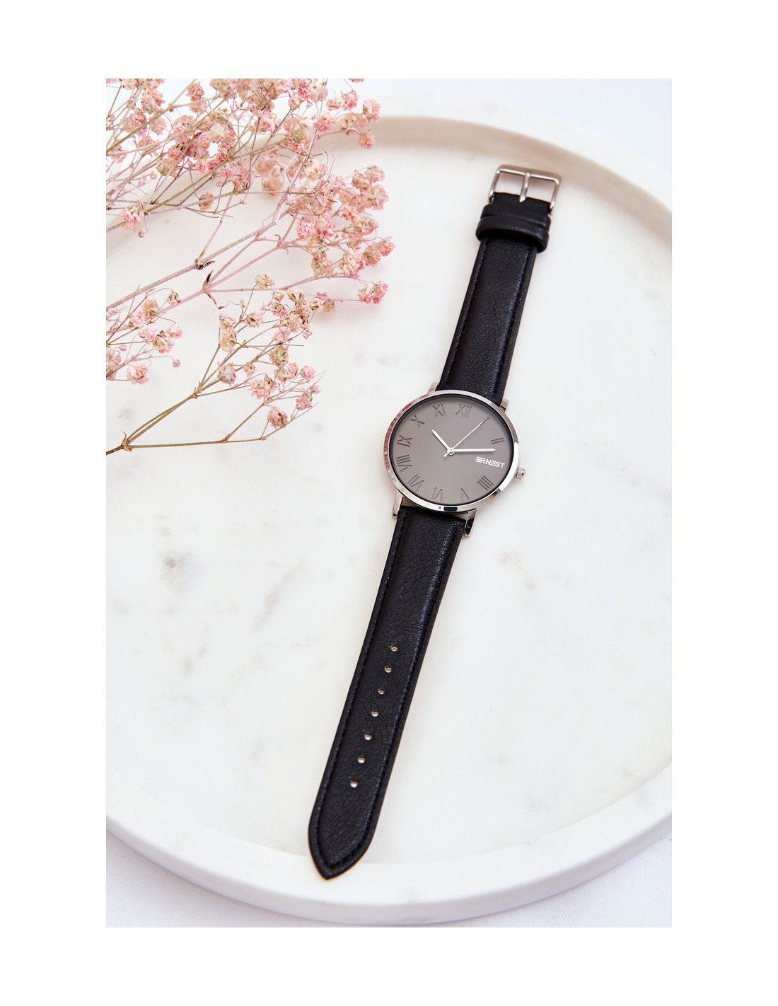 Klasikinis moteriškas laikrodis su dideliu, matomu ciferblatu su romėniškais skaitmenimis. Skambinkite laikrodžio dirželio šešėlyje. Laikrodis užsegamas reguliuojamu dirželiu su sagtimi. Be nikelio. Korpusas pagamintas iš nerūdijančio plieno, o apyrankė – iš eko odos.
