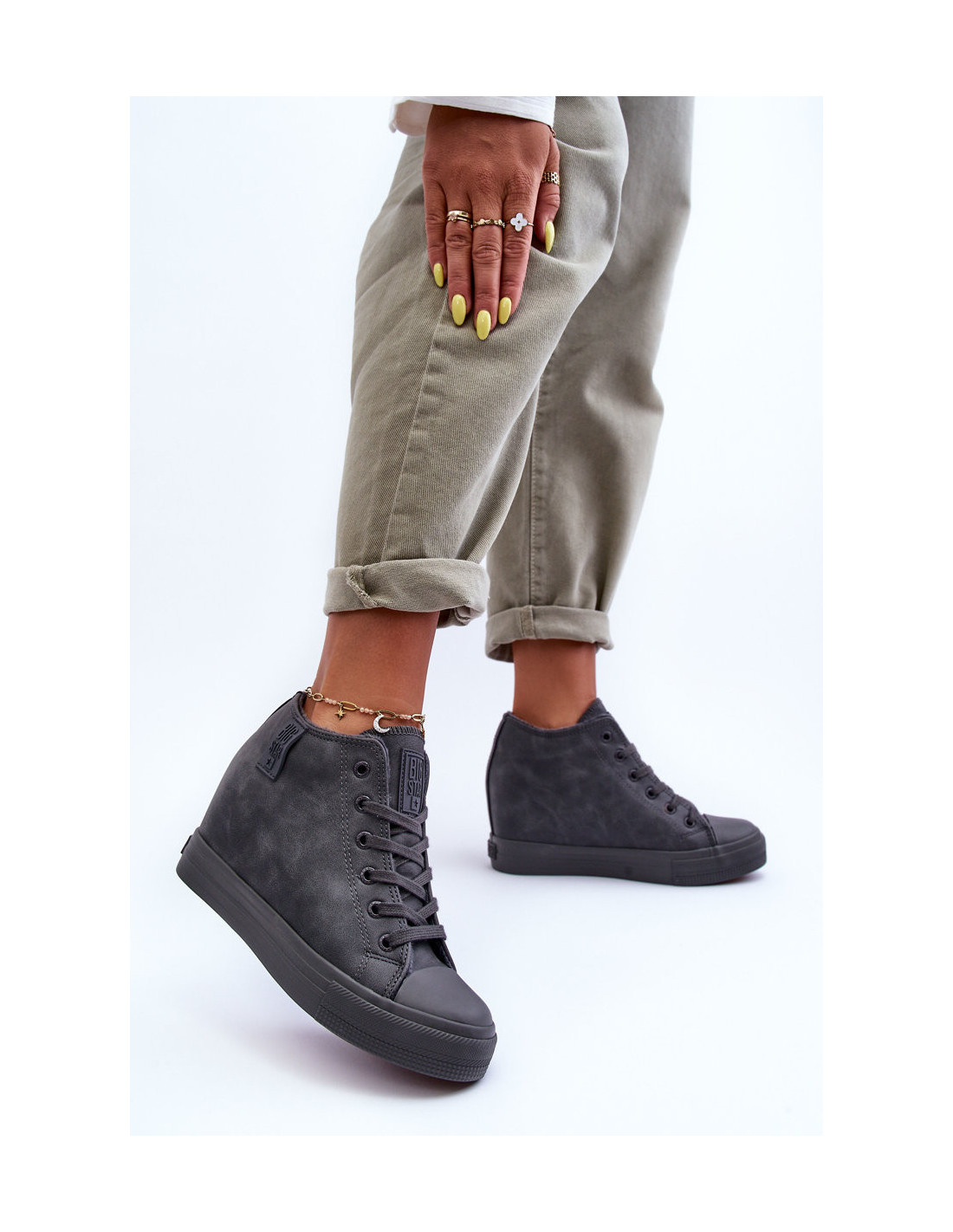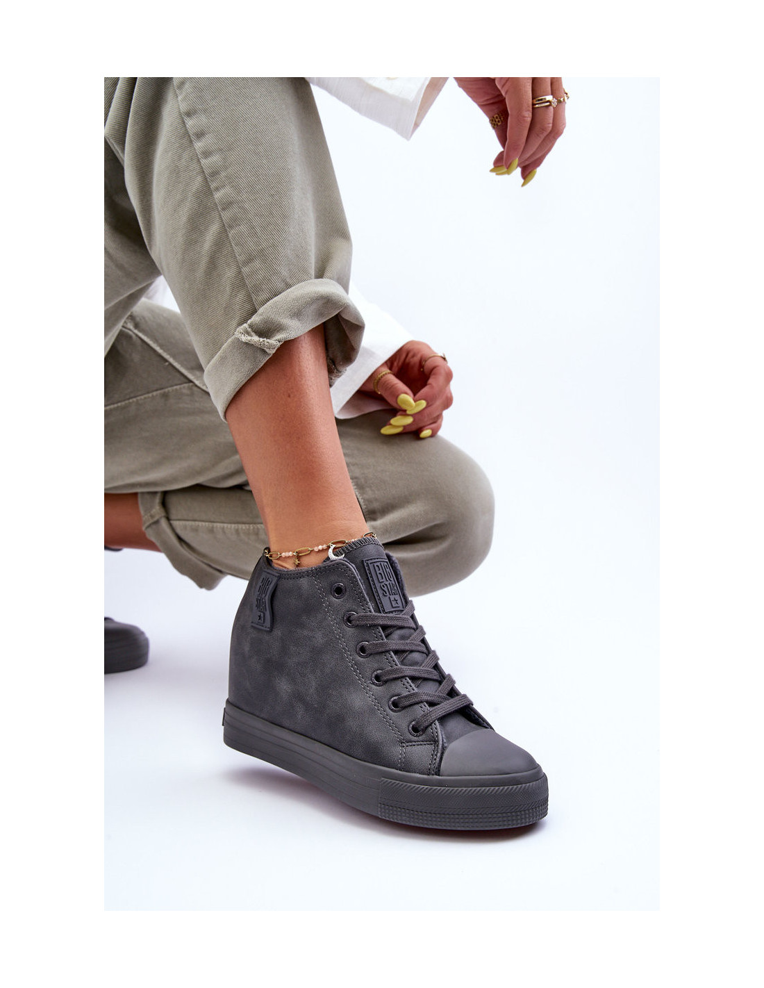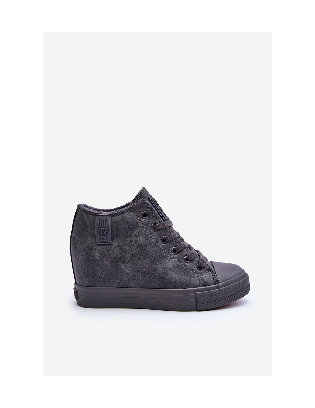 Moteriški BIG STAR sportbačiai pagaminti iš ekologiškos odos. Jie turi medžiaginį vidpadį ir klasikinį suvarstymą. Pastatykite ant platformos ir aukšto pleišto. Izoliuotas kailiuku. Šis modelis puikiai tinka daugeliui stilizacijų, todėl privalote jį turėti savo garderobe! Pavasario-vasaros sezonu tikrai naudosite! Rinkdamiesi dydį, vadovaukitės dydžių lentele.