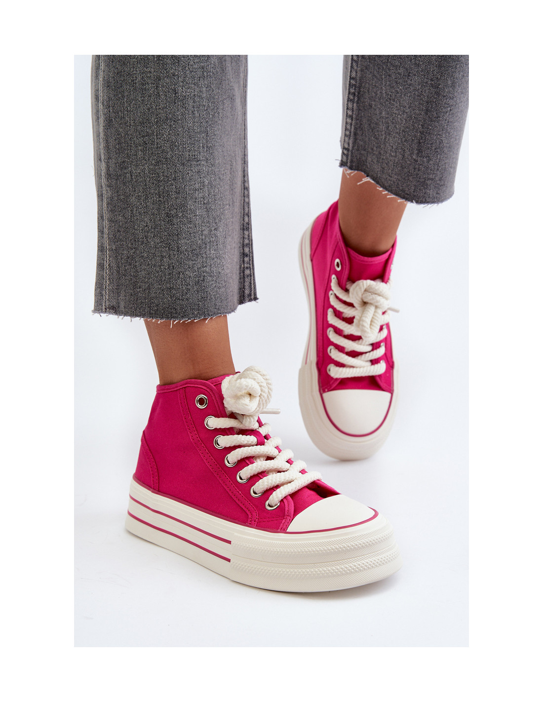 Moteriški sportbačiai iš tekstilės medžiagos. Masyvi platforma iš gumos suteikia jiems madingą išvaizdą ir užtikrina stabilumą einant. Suapvalinti kojų pirštai ir klasikiniai suvarstyti, todėl jie yra universalus daugelio kasdienių stilių priedas. Nesvarbu, ar einate pasivaikščioti po miestą, ar susitikti su draugais, šie sportbačiai bus puikus pasirinkimas. Renkantis dydį, vadovaukitės dydžių lentele.