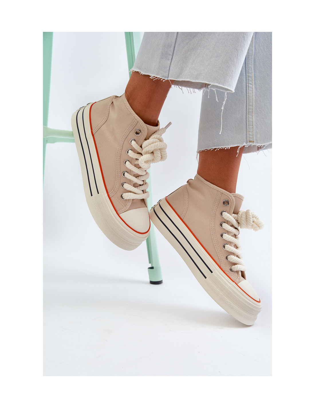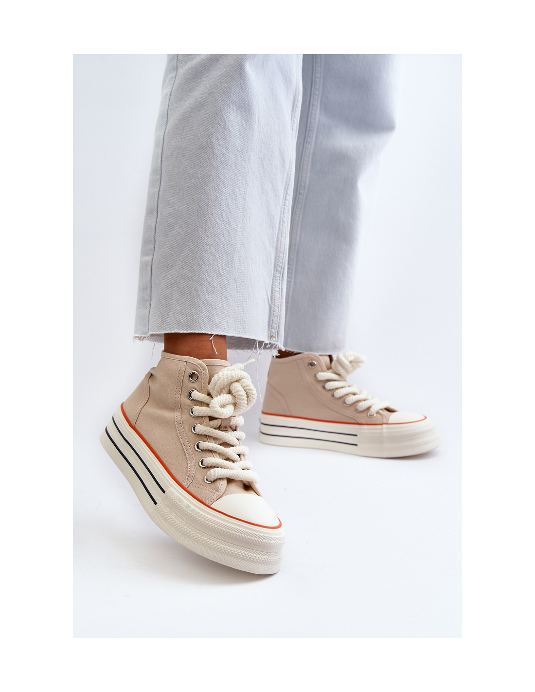 Moteriški sportbačiai iš tekstilės medžiagos. Masyvi platforma iš gumos suteikia jiems madingą išvaizdą ir užtikrina stabilumą einant. Suapvalinti kojų pirštai ir klasikiniai suvarstyti, todėl jie yra universalus daugelio kasdienių stilių priedas. Nesvarbu, ar einate pasivaikščioti po miestą, ar susitikti su draugais, šie sportbačiai bus puikus pasirinkimas. Renkantis dydį, vadovaukitės dydžių lentele.