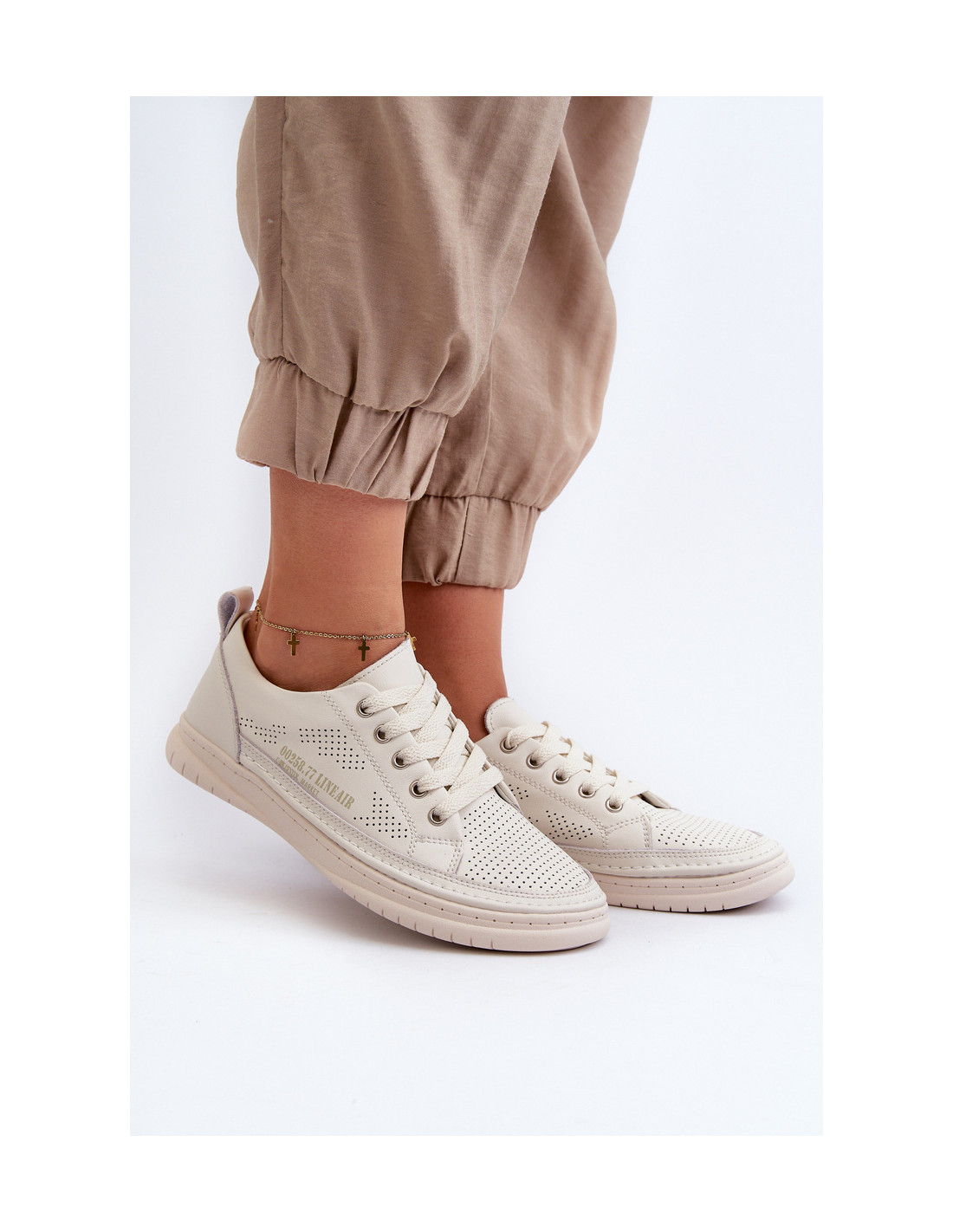 Klasikiniai sportbačiai su guminiu padu. Su žema viršutine dalimi virš kulkšnies. Modelis surištas apvaliais raišteliais. Pagamintos iš natūralios, minkštos odos su perforacija, todėl jos itin erdvios ir patogios naudoti. Patogus vidpadis taip pat pagamintas iš natūralios odos. Jie puikiai derės prie kasdieninio stiliaus, ypač prie džinsų ar šortų. Lengvi ir madingi – jų turėtum turėti savo garderobe! Renkantis dydį, vadovaukitės dydžių lentele.