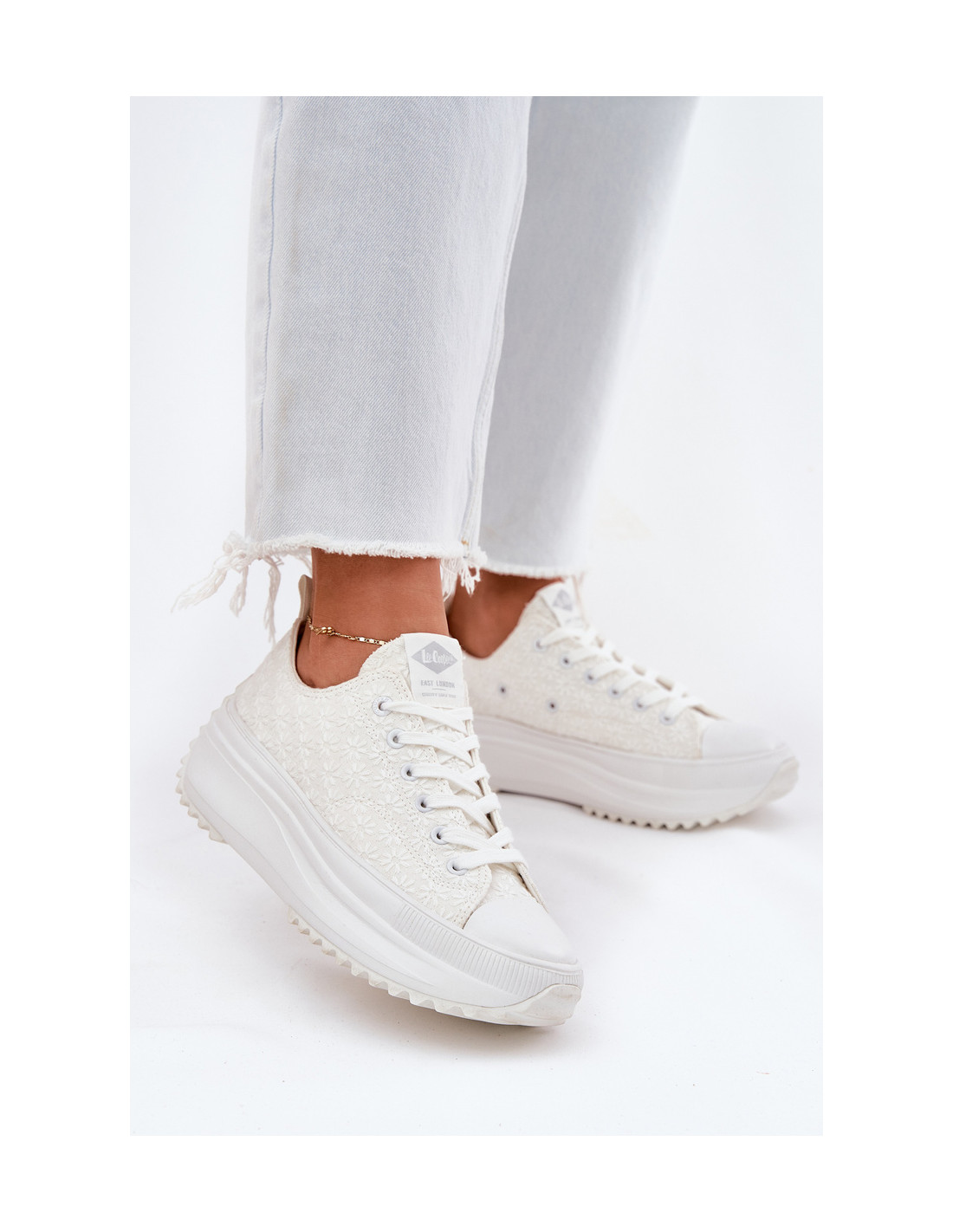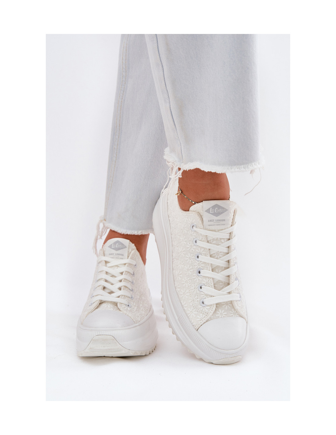 Moteriški Lee Cooper sportbačiai yra stiliaus ir patogumo derinys. Ant masyvios platformos jie suteikia stabilumo ir lengvumo visą dieną. Subtiliais siuvinėjimais dekoruota viršutinė dalis suteikia jiems nepakartojamo charakterio, o klasikinis suvarstymas leidžia puikiai priglusti prie pėdos. Suapvalinti pirštai garantuoja komfortą kiekviename žingsnyje. Šie sportbačiai puikiai tiks prie laisvalaikio ir elegantiškesnio stiliaus, suteikdami madingą ir originalų akcentą. Renkantis dydį, vadovaukitės žemiau esančia dydžių lentele.