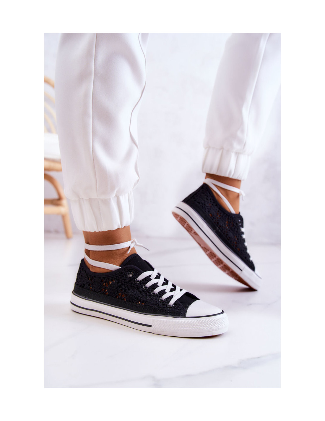 Batai puikiai priglunda prie pėdos formos. Jie turi minkštą, medžiaginį vidpadį ir neslidų padą. Jie pagaminti iš ažūrinės tekstilės medžiagos. Ant plačių plokščių raištelių surišami sportbačiai. Apvalus pirštas sutvirtintas guma. Erdvus modelis, puikiai tinkantis pavasario ir vasaros sezonui. Juos galite derinti prie džinsų, erdvaus sijono ar šortų! Rinkdamiesi dydį vadovaukitės dydžių lentele.