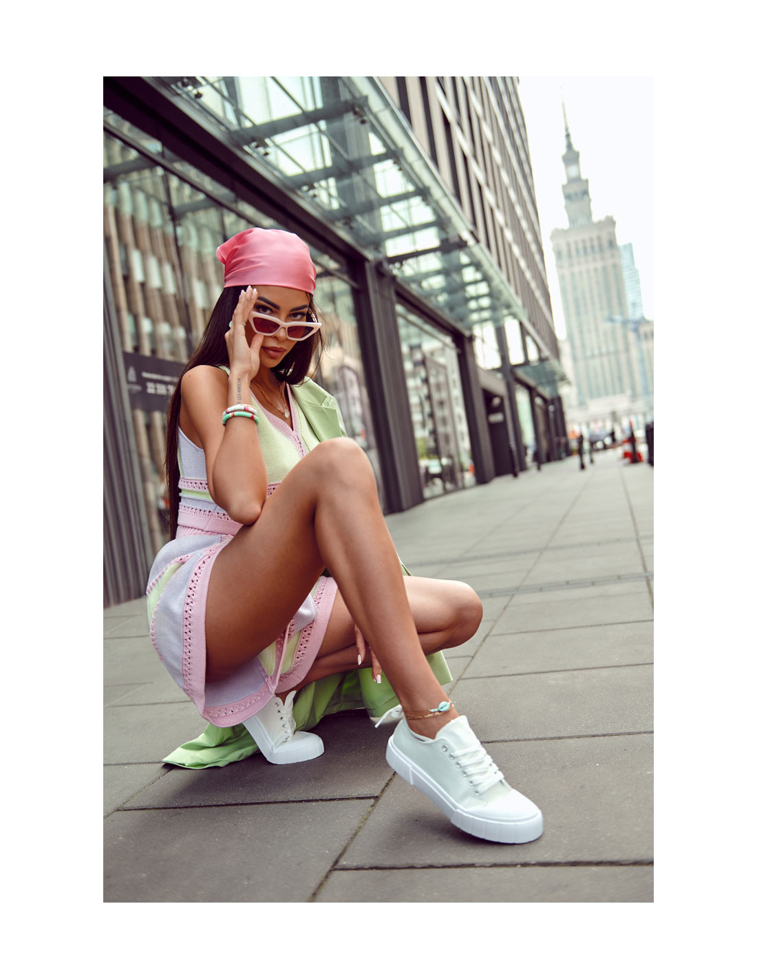 Moteriški sportbačiai ant platformos yra balti