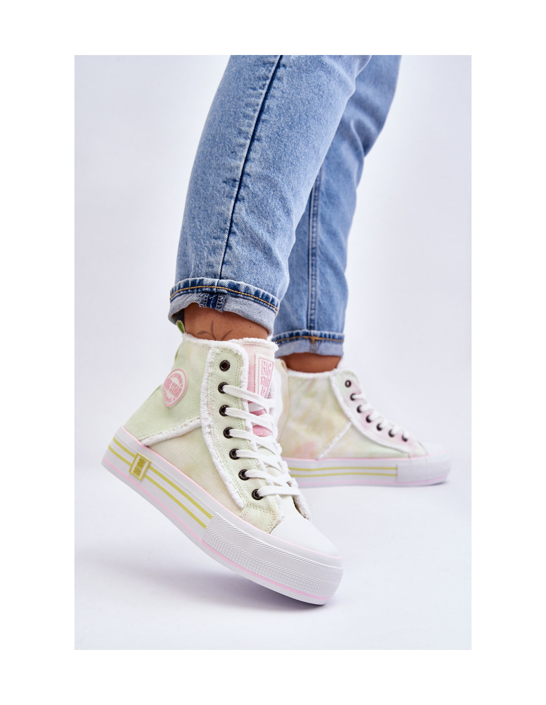 Aukšti moteriški sportbačiai pagaminti iš tekstilės. Viršutinės dalies šone yra Big Star prekės ženklo logotipas. Šis modelis surištas klasikiniu būdu. Batai buvo pastatyti ant masyvios, guminės platformos su neslidžiu padu. Be to, sportbačiai turi standintą kulno skaitiklį ir guma sutvirtintą pirštų dangtelį. Rinkdamiesi dydį žiūrėkite dydžių lentelę.