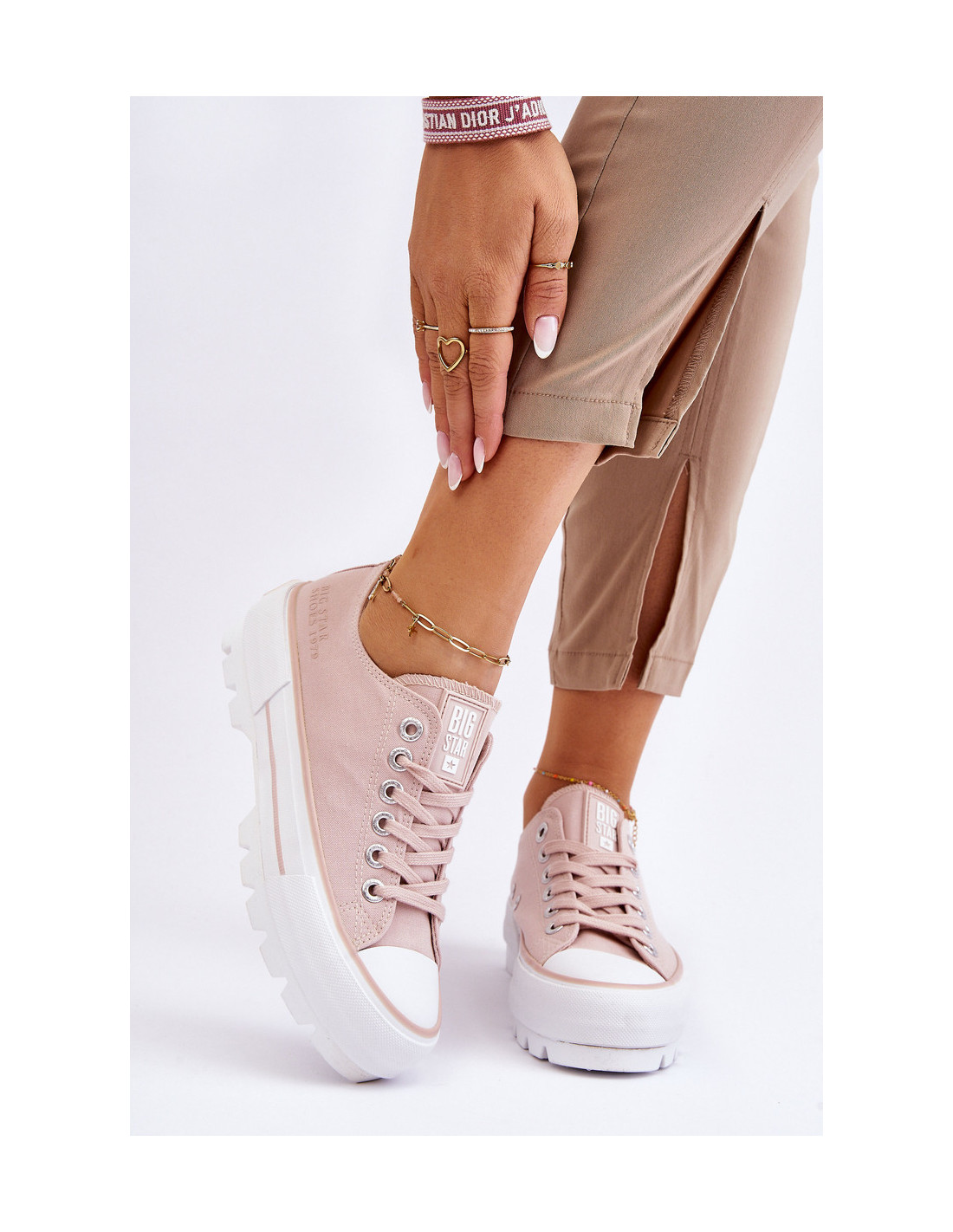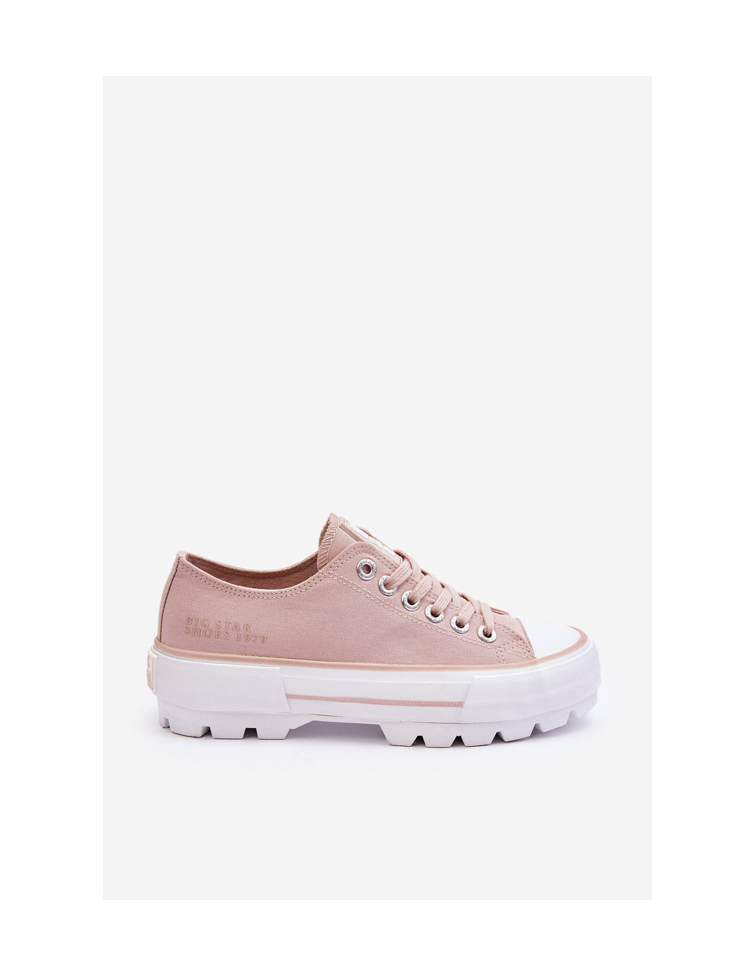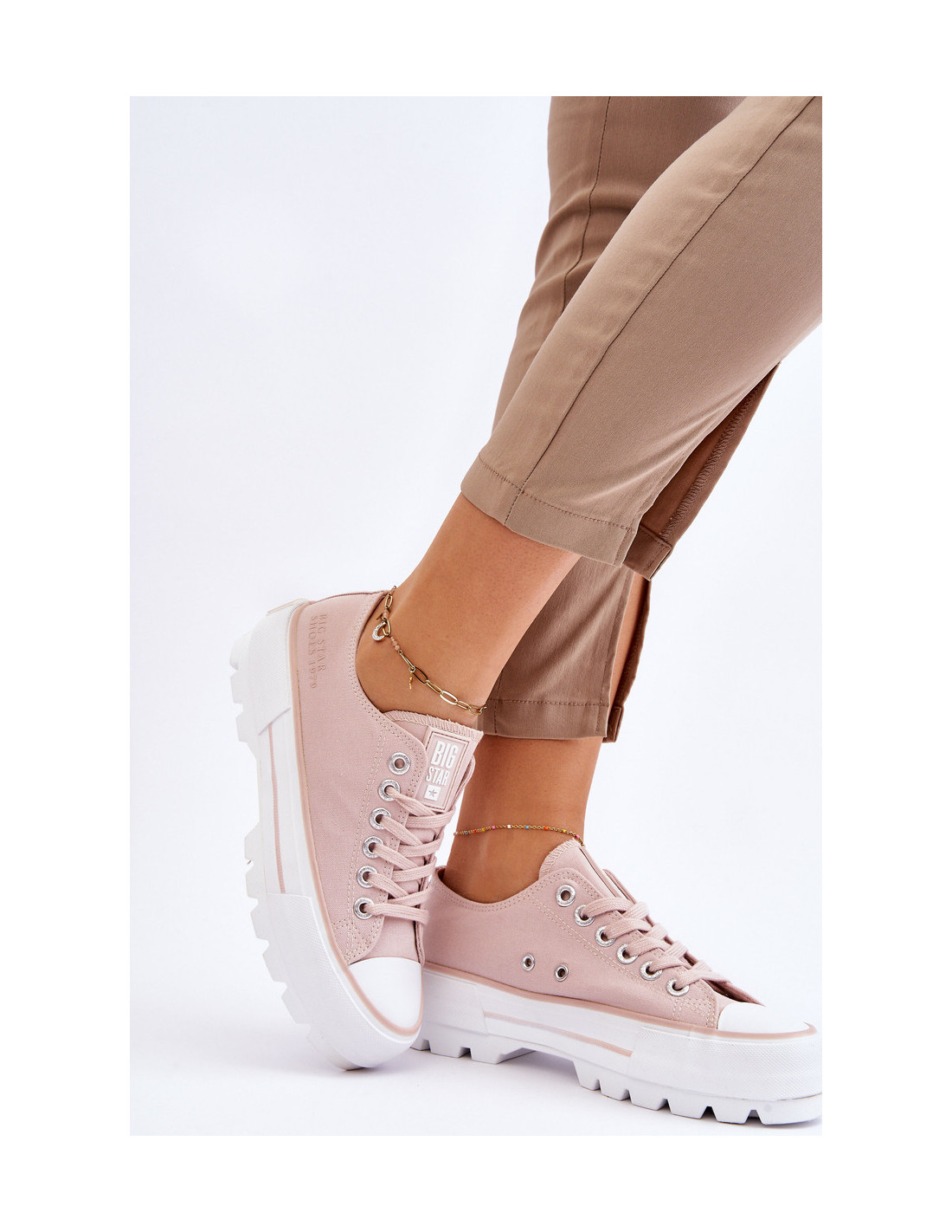 Madingi prekės ženklo „Big Star“ moteriški sportbačiai! Modernus dizainas ir padas su aukštu protektoriumi išskiria šį modelį iš kitų! Viršutinė dalis pagaminta iš tekstilės medžiagos. Šie sportbačiai taip pat turi šiek tiek standesnį kulno skaitiklį. Platforma ir padas pagaminti iš guminės medžiagos. Rinkdamiesi dydį žiūrėkite dydžių lentelę.