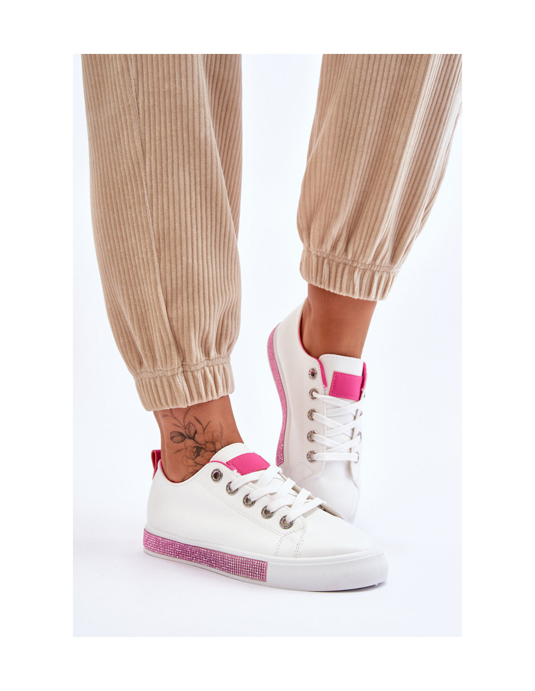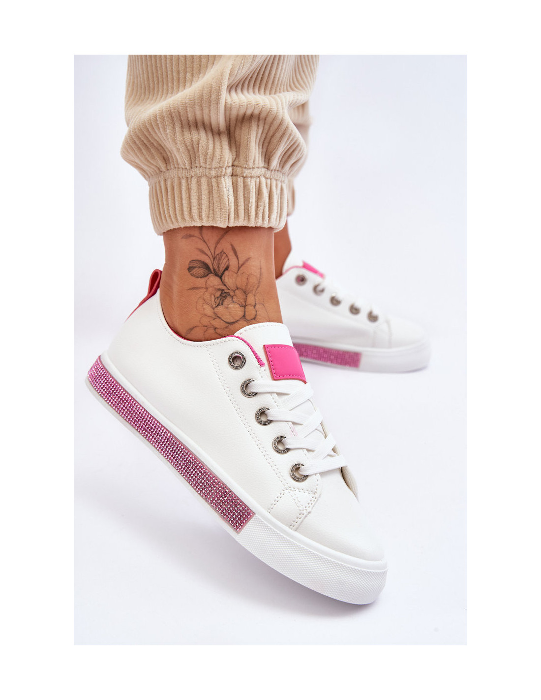 Žemi sportbačiai yra nesenstantis modelis, todėl turėtumėte juos turėti savo garderobe! Su jais galite sukurti daug įdomių stilių. Jie tinka tiek prie džinsų, tiek prie erdvių suknelių. Pagaminta iš eko odos su madingomis dekoracijomis ant platformos kalnų krištolų pavidalu, imituojančių kalnų krištolą. Jie turi minkštą įdėklą, kurį galima išimti. Rinkdamiesi dydį žiūrėkite dydžių lentelę.