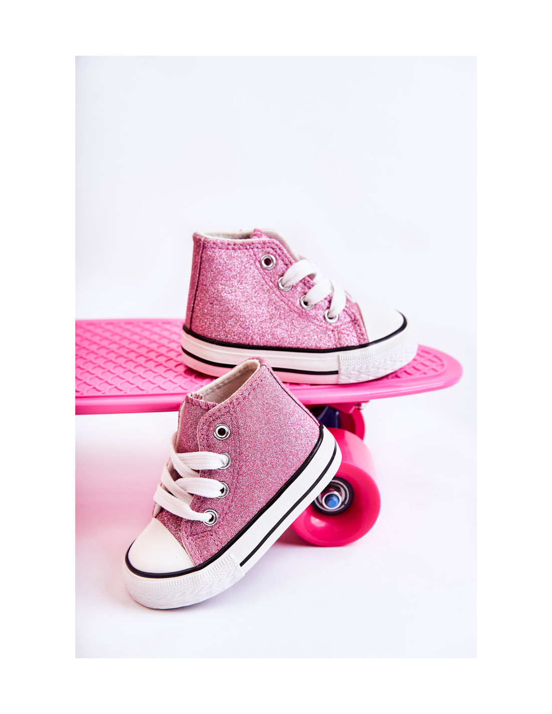 Aukšti vaikiški sportbačiai iš tekstilės. Dekoruotas blizgučiais. Klasikinis įrišimas. Pirštas sustiprintas guma. Minkštas ir tekstilinis vidpadis. Guminis padas ir neslystantis. Lengvi ir patogūs sportbačiai. Puikiai tinka pavasario ir vasaros sezonui. Renkantis dydį, naudokite dydžių lentelę.