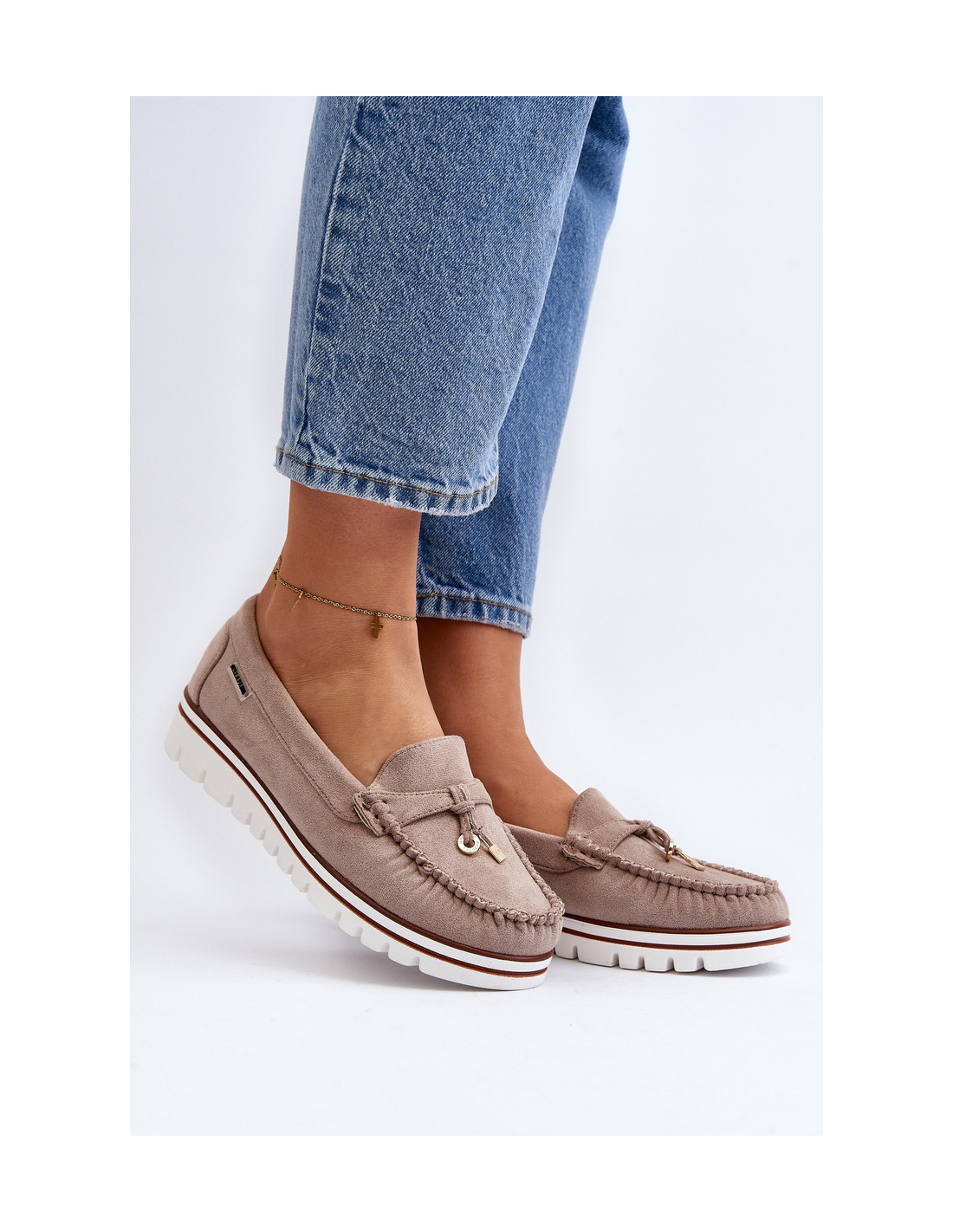 Moteriški mokasinai iš ekologiškos zomšos. Montuojamas ant platformos. Suapvalinti kojų pirštai. Šis modelis turi minkštą įdėklą iš natūralios odos, kuris užtikrina komfortą dėvint. Priekyje nedideli pakabukai. Klasikinis stilius, kuris derės prie daugelio pavasario ir vasaros stilių! Renkantis dydį, vadovaukitės dydžių lentele.