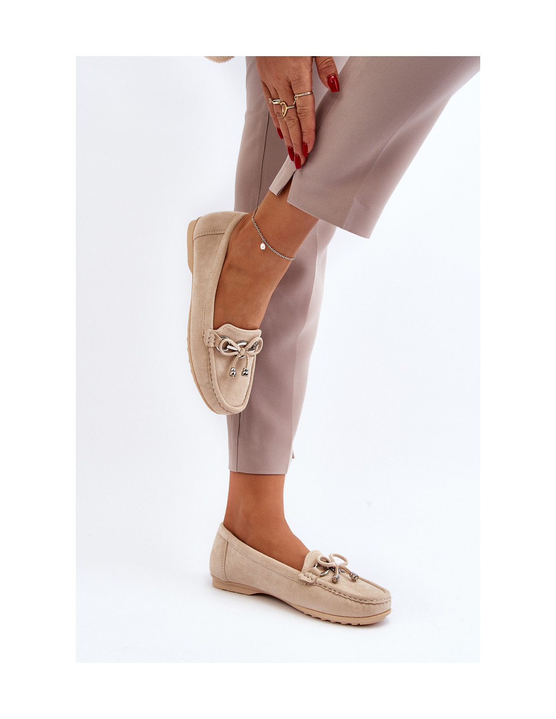 Klasikiniai moteriški mokasinai pagaminti iš malonaus liesti ekologiškos zomšos. Jų neslidus padas užtikrina saugų žingsnį įvairiais paviršiais. Minkštas eko odos vidpadis užtikrina komfortą avint batus. Priekyje yra lankelis ir plastikinė dekoracija. Tai modelis, kuris turėtų būti jūsų pavasario-vasaros garderobe! Renkantis dydį, vadovaukitės dydžių lentele.