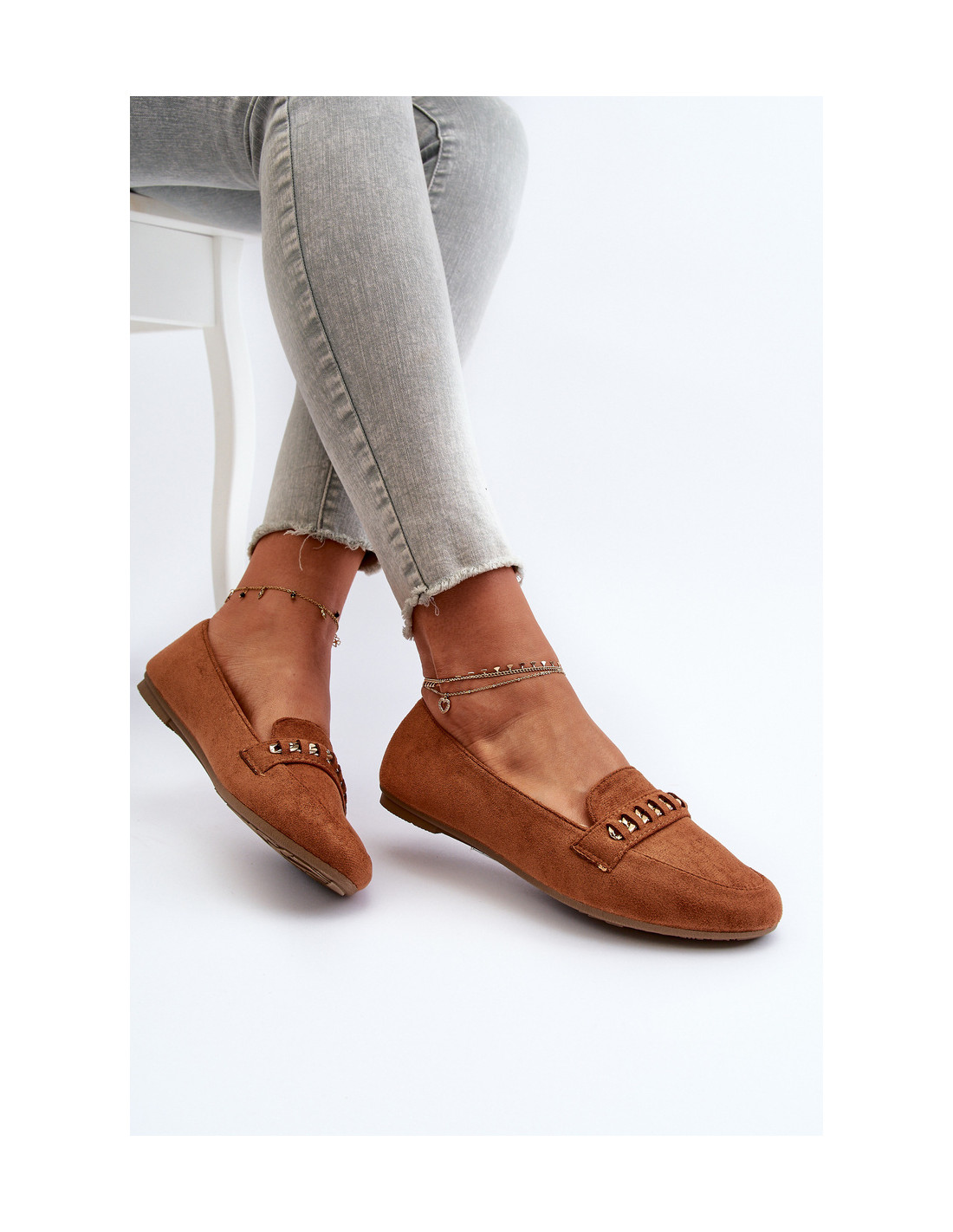 Blizgūs moteriški mokasinai su grandinėle Camel Aredilla
