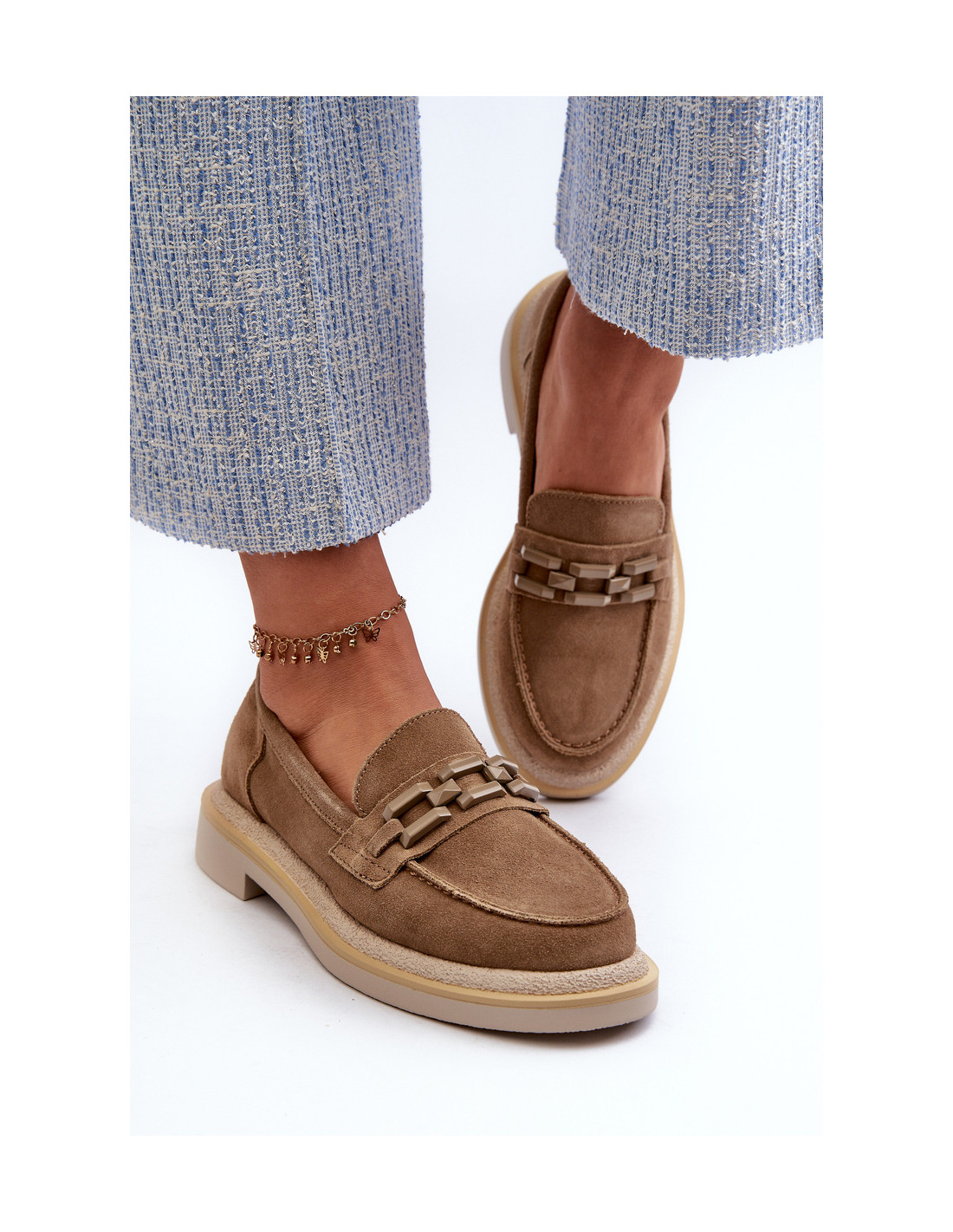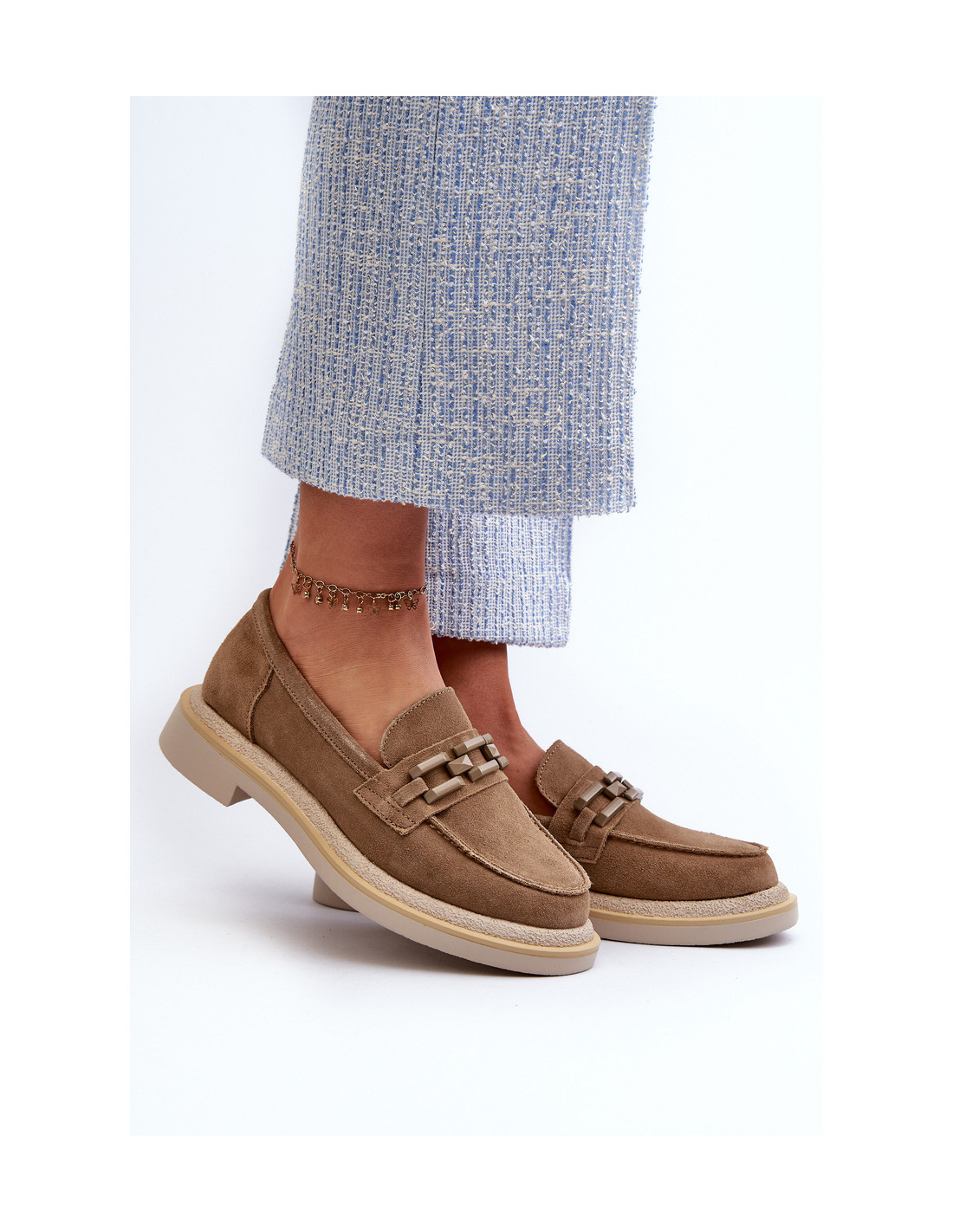 Moteriški mokasinai iš natūralios zomšos. Plokščias kulnas garantuoja stabilumą ir komfortą einant. Originalumo suteikia papildomas dekoratyvinis elementas priekyje, todėl jos tampa ne tik praktiškos, bet ir madingos. Šie bateliai puikiai papildys daugybę skirtingų stilių – tiek kasdienių, tiek elegantiškesnių. Renkantis dydį, vadovaukitės dydžių lentele.