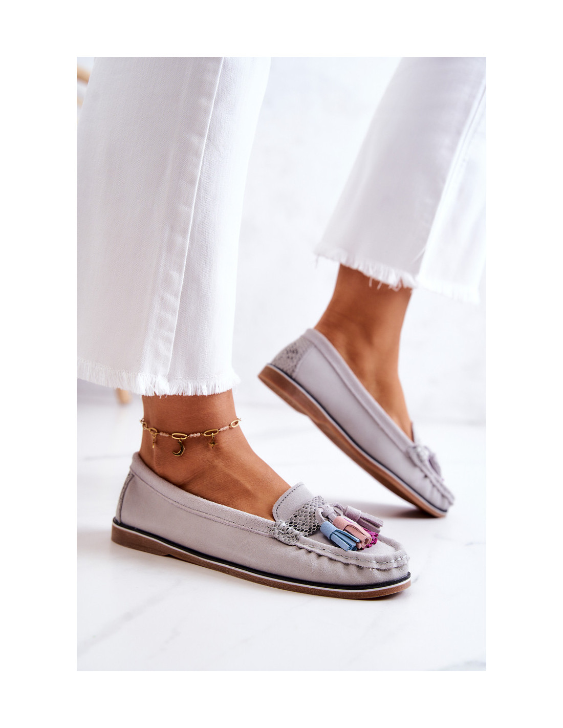 Loafers yra batai, kurie niekada neišeis iš mados. Jie tinka tiek kasdieniam, tiek elegantiškesniam stiliui. „Comfort Shoes“ odinis vidpadis su subtilia perforacija yra komforto garantija naudojant. Viršutinė dalis pagaminta iš natūralios zomšos odos su dekoratyviniais kutais priekyje. Padas iš guminės medžiagos plokščiu kulnu papildomai neslysta. Puikus modelis, kurį turėtumėte turėti savo garderobe! Renkantis dydį, naudokite dydžių lentelę.