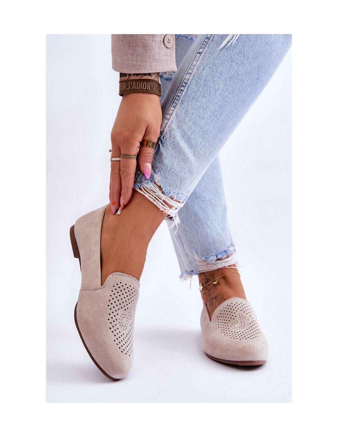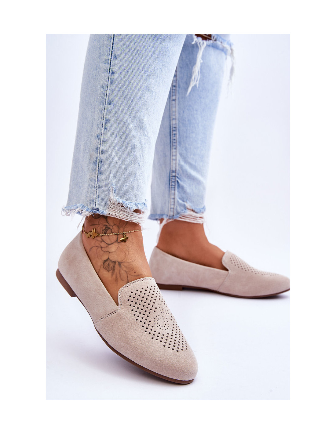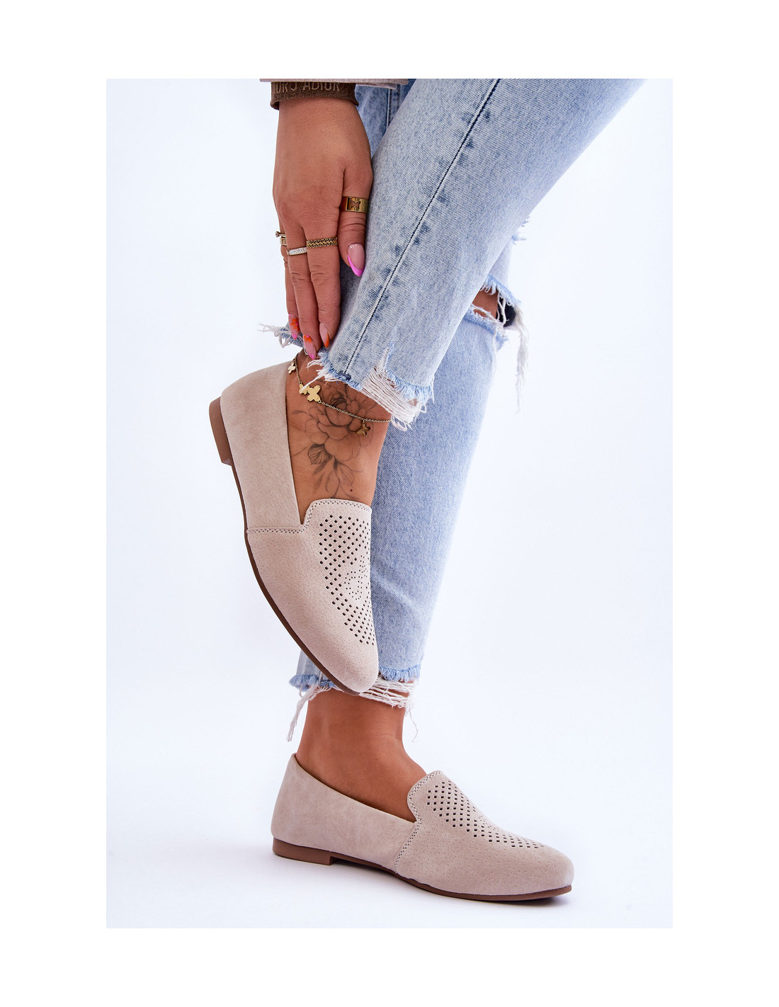 Nuostabūs moteriški batukai iš natūralios zomšos. Jie turi dekoratyvų, ažūrinį raštą priekyje. Šis modelis buvo pastatytas ant plokščio kulno ir neslidaus pado. Loafers turi Comfort vidpadį, pagamintą iš natūralios odos. Šių batų kulnas yra šiek tiek standesnis. Jūs tikrai turėtumėte juos turėti! Rinkdamiesi dydį, vadovaukitės dydžių lentele.