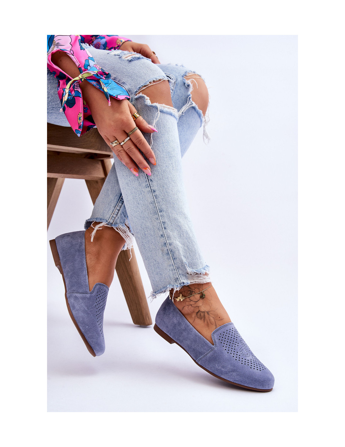 Nuostabūs moteriški batukai iš natūralios zomšos. Jie turi dekoratyvų, ažūrinį raštą priekyje. Šis modelis buvo pastatytas ant plokščio kulno ir neslidaus pado. Loafers turi Comfort vidpadį, pagamintą iš natūralios odos. Šių batų kulnas yra šiek tiek standesnis. Jūs tikrai turėtumėte juos turėti! Rinkdamiesi dydį, vadovaukitės dydžių lentele.