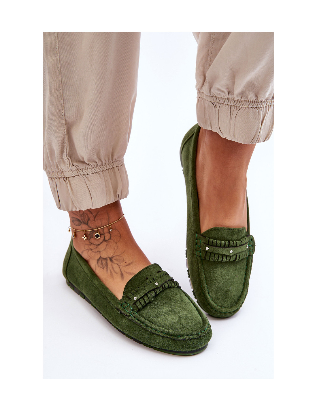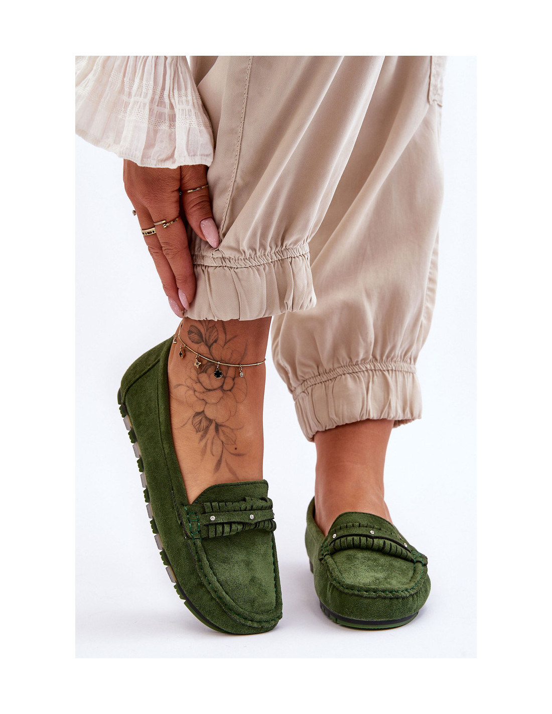 Klasikiniai moteriški mokasinai, puikiai tinkantys įvairioms progoms, yra pagaminti iš ekologiškos zomšos. Šio modelio priekyje yra dekoratyvinė juostelė su smeigtukais. Mokasinai buvo pastatyti ant žemos platformos. Minkštas vidpadis iš eko odos užtikrins komfortą naudojant avalynę. Šis modelis turi kvadratinę nosį. Rinkdamiesi dydį žiūrėkite dydžių lentelę.