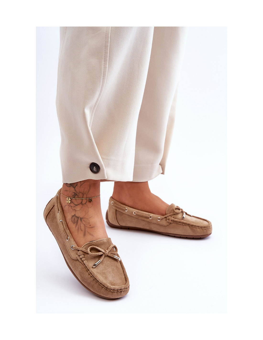 Šie klasikiniai moteriški mokasinai yra pagaminti iš ekologiškos zomšos. Modelis turi dekoratyvinį lankelį priekyje ir raištelius per šonus. Mokasinai tvirtinami ant neslystančio pado. Minkštas vidpadis iš eko odos suteiks komforto avint batus. Jis taip pat švelniai perforuotas. Turite juos turėti savo batų kolekcijoje! Rinkdamiesi dydį, žiūrėkite dydžių lentelę.