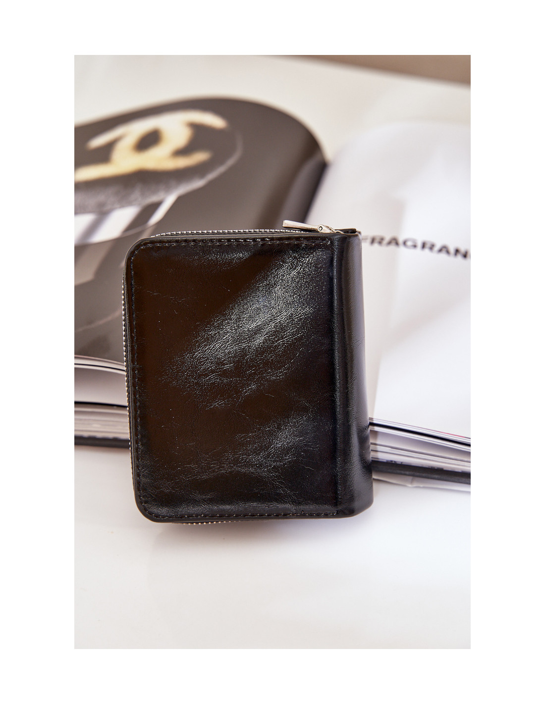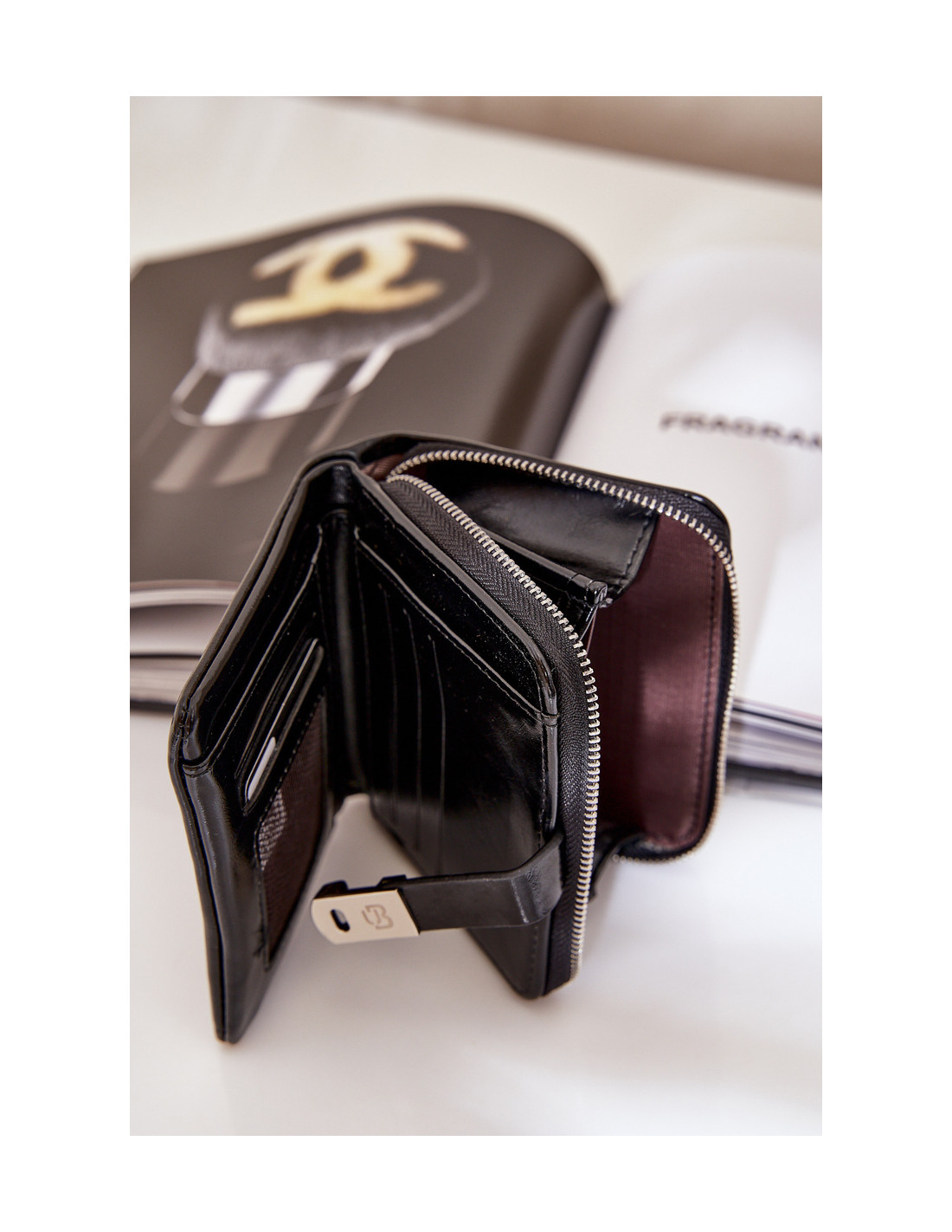 Moteriška piniginė iš lakinės eko odos. Turi užtrauktuku užsegamą monetų kišenę. Viduje yra skyriai banknotams ir kortelėms. Užsegamas magnetuku. Klasikinis dizainas, kuris tikrai patiks kiekvienai moteriai!
