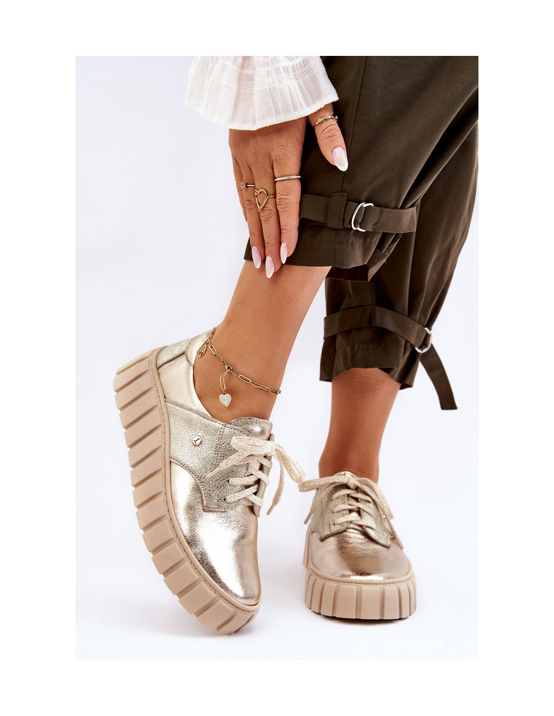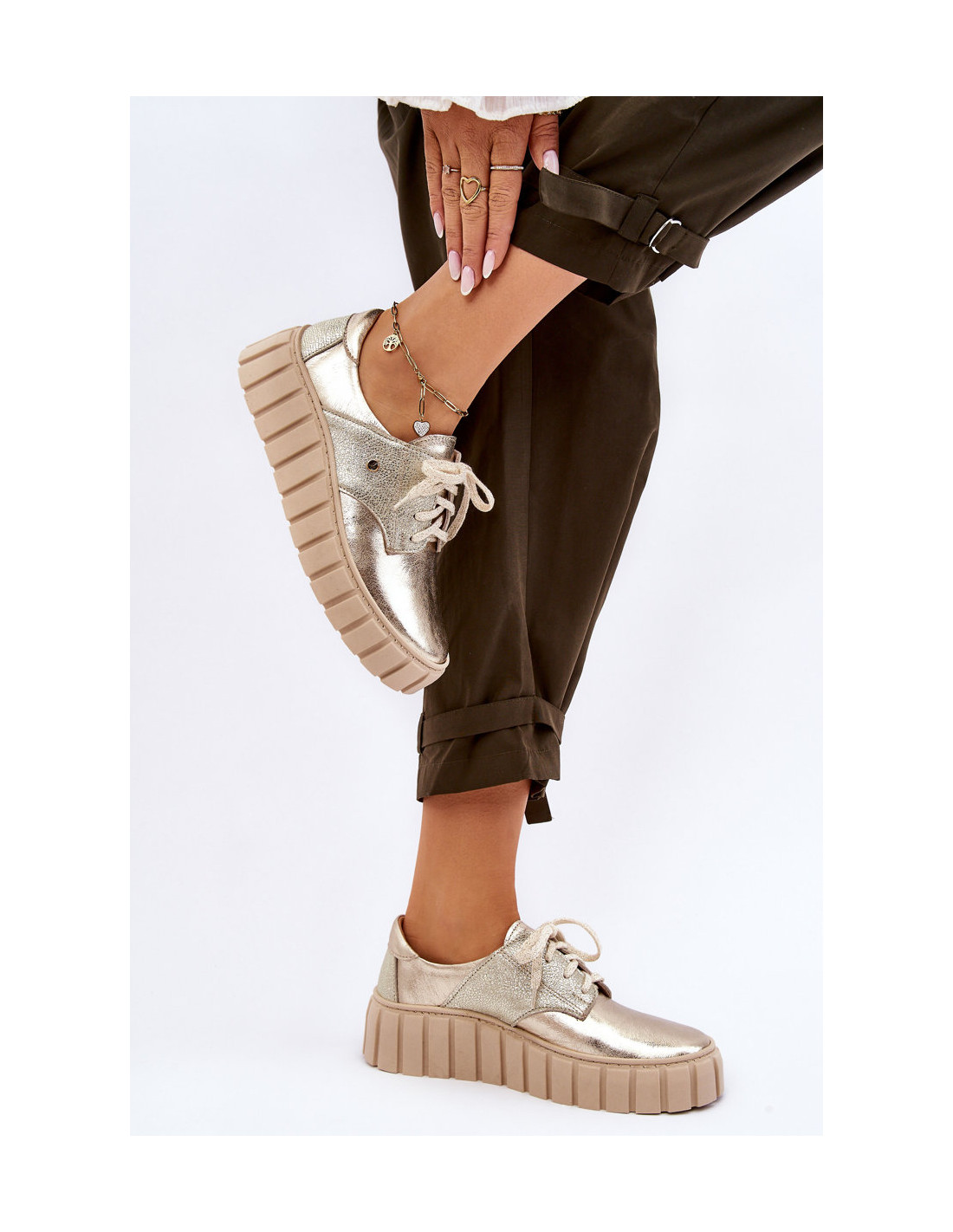 Batai turi plokščius raištelius, dekoruotus blizgančiais siūlais. Pastatykite ant masyvios platformos su grioveliais šonuose. Viduje yra patogus įdėklas iš natūralios odos, kuris papildomai profiliuotas. Kulkšnies viršus pagamintas iš natūralios odos su metaliniu efektu. Labai lengvas ir patogus naudoti. Puikiai tiks prie elegantiškų kelnių, tiulio sijonų ar megztų suknelių. Juos galite derinti prie įvairių stilių – jie visada atrodys puikiai! Šiuos nuostabius batus tikrai būtina turėti jūsų garderobe! Renkantis dydį, vadovaukitės dydžių lentele.