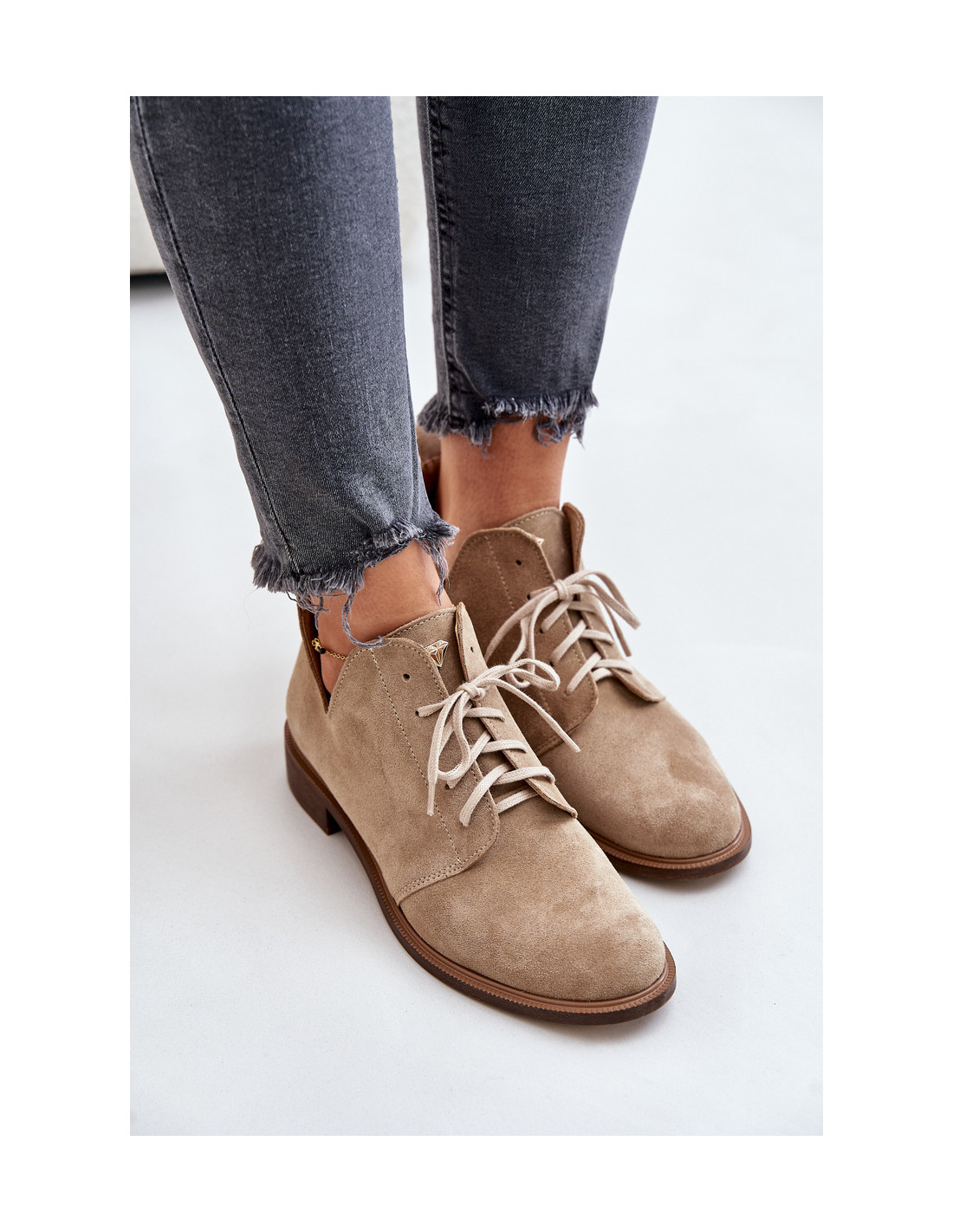 Zazoo 2959 zomšiniai Oxfords suvarstomi batai plokščiakulniais smėlio spalvos