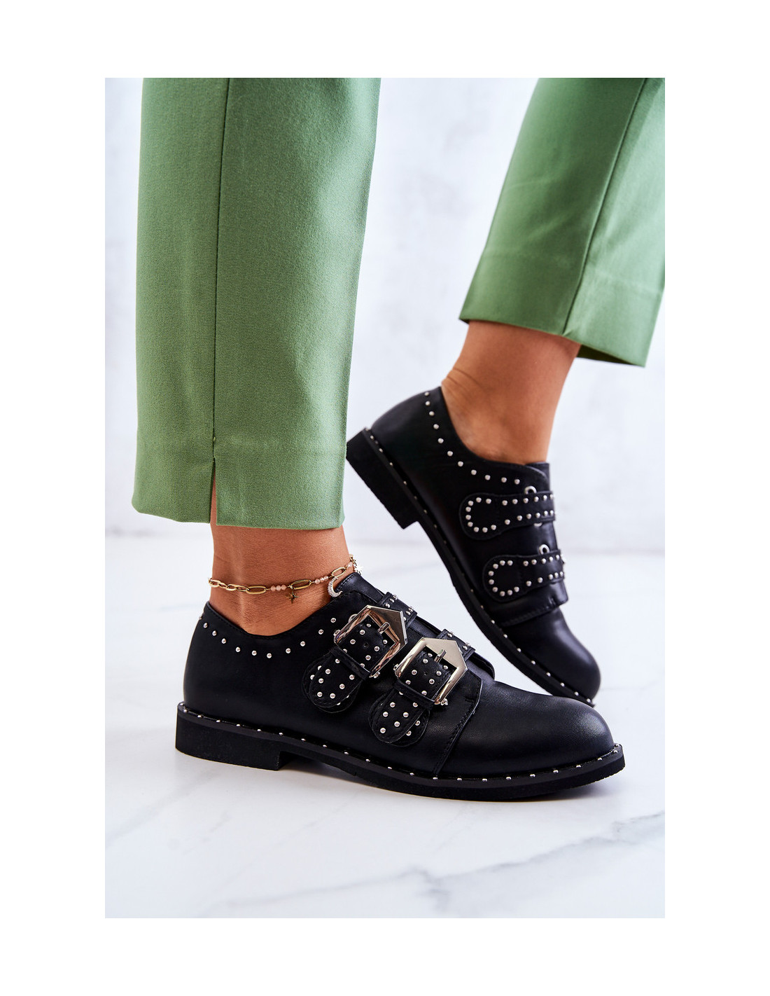 Unikalūs moteriški LU BOO batai su sagtimis. Batai pagaminti iš eko odos. Jie turi smeigtukus viršaus, pado ir dirželių viršuje. Modelis montuojamas ant plokščio kulno, pagaminto iš guminės medžiagos. Petnešėlės reguliuojamos, užsegamos sagtimi. Nosis šiek tiek pailgos, migdolo formos. Vidpadis pagamintas iš eko odos. Būtinai peržiūrėkite visą mūsų moteriškų batų kolekciją! Rinkdamiesi dydį vadovaukitės dydžių lentele.