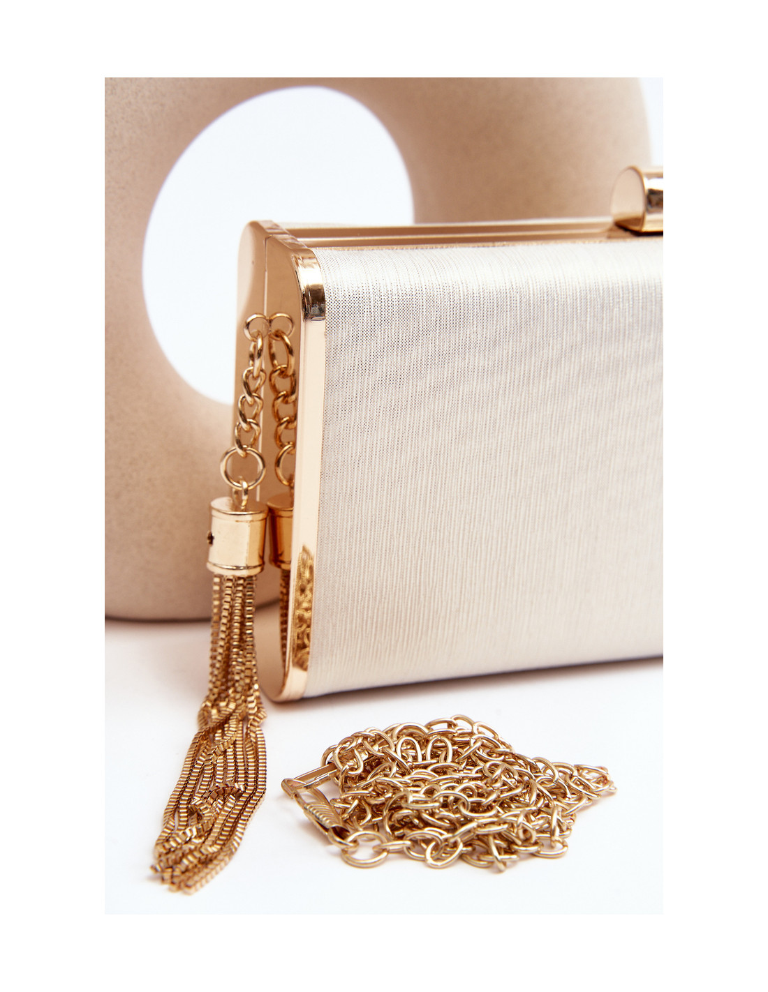 Oficialus krepšys, pagamintas iš blizgios medžiagos. Nuimama grandinėlė leidžia nešiotis rankoje kaip klasikinį sankabos krepšį. Šis modelis puikiai papildys bet kokį proginį stilių, suteikdamas elegancijos. Be to, jis turi papuošimą kutais.