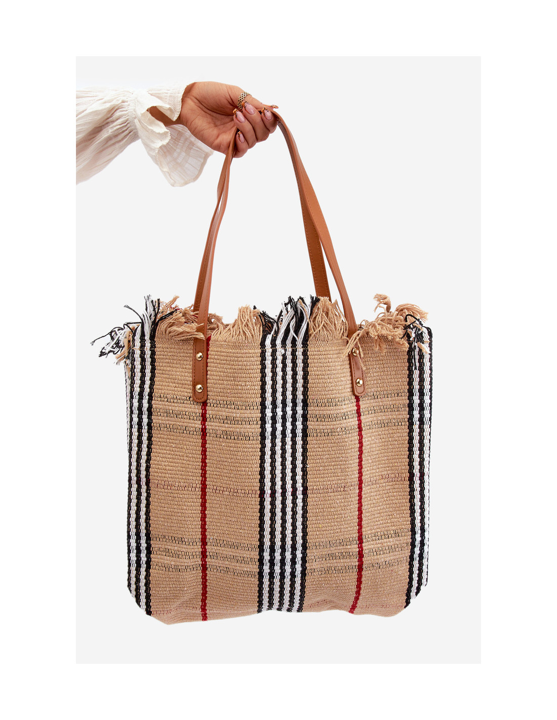 Didelė moteriška rankinė iš austo audinio. Vieno skyriaus, užsegamas užtrauktuku. Dėl savo talpos jame telpa visi reikalingi daiktai! Puikiai tinka praleistoms dienoms paplūdimyje ir kaip priedas prie kasdieninio vasaros stiliaus!