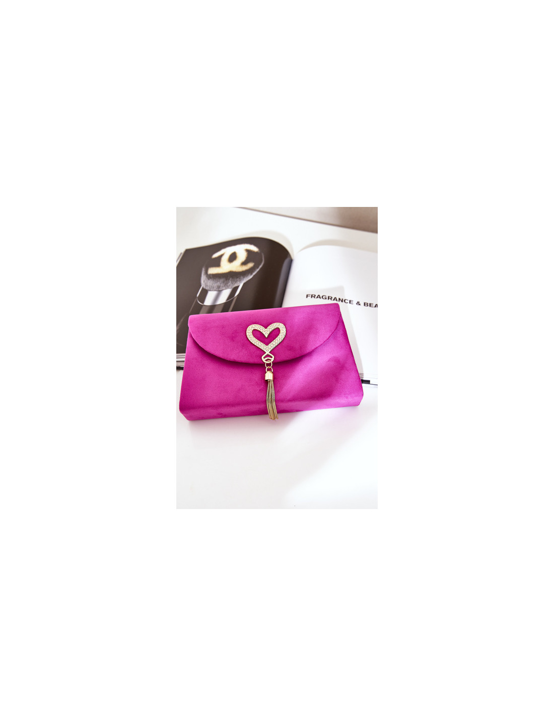 Elegantiškas rankinė, pagamintas iš ekologiškos zomšos, puikiai tinkantis ypatingoms progoms. Užsegamas magnetiniu segtuku, užtikrinančiu komfortą ir saugumą. Viduje yra praktiška kišenė smulkiems daiktams. Krepšys turi nuimamą grandinės dirželį, todėl jį galima nešioti įvairiai. Stilingas aksesuaras, paryškintas dekoratyvine širdele, kuri suteikia žavesio ir unikalaus charakterio.