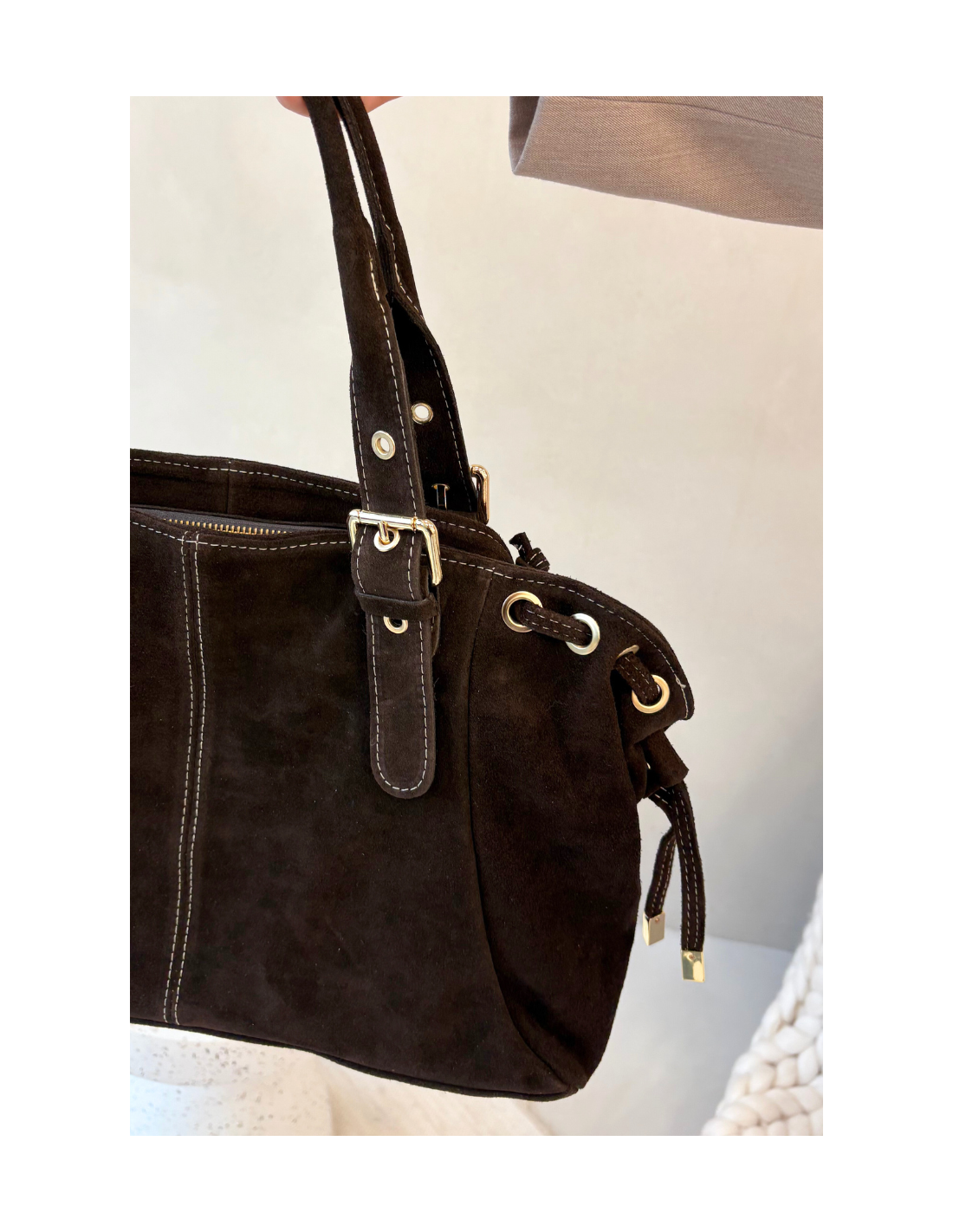 Ši moteriška rankinė, pagaminta iš natūralios zomšos, yra madingas pasirinkimas, puikiai tinkantis tiek kasdieniam nešiojimui, tiek oficialiai aprangai. Auksinės detalės pabrėžia jos moterišką charakterį. Ji turi vidines kišenes, kuriose lengva susidėti būtiniausius daiktus. Rankinė turi patogias rankenas ir neturi papildomo dirželio, todėl atrodo klasikiškai minimalistiškai. Tai stilingas aksesuaras, kuris papildys beveik bet kokią aprangą.