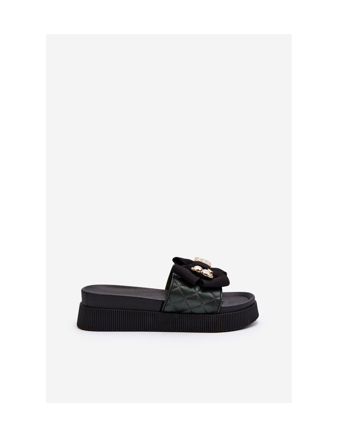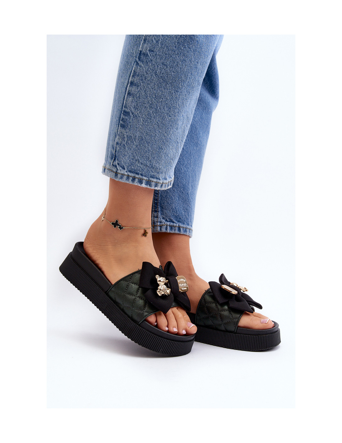 Moteriškos šlepetės iš eko odos. Įrengtas ant didžiulės platformos. Šis modelis turi medžiaginį lankelį ir segtuko imitaciją su meškiuku bei lėkštę su užrašu. Tobuli šlepetės ateinančiam sezonui! Jūs tikrai turėtumėte juos turėti! Renkantis dydį, vadovaukitės dydžių lentele.