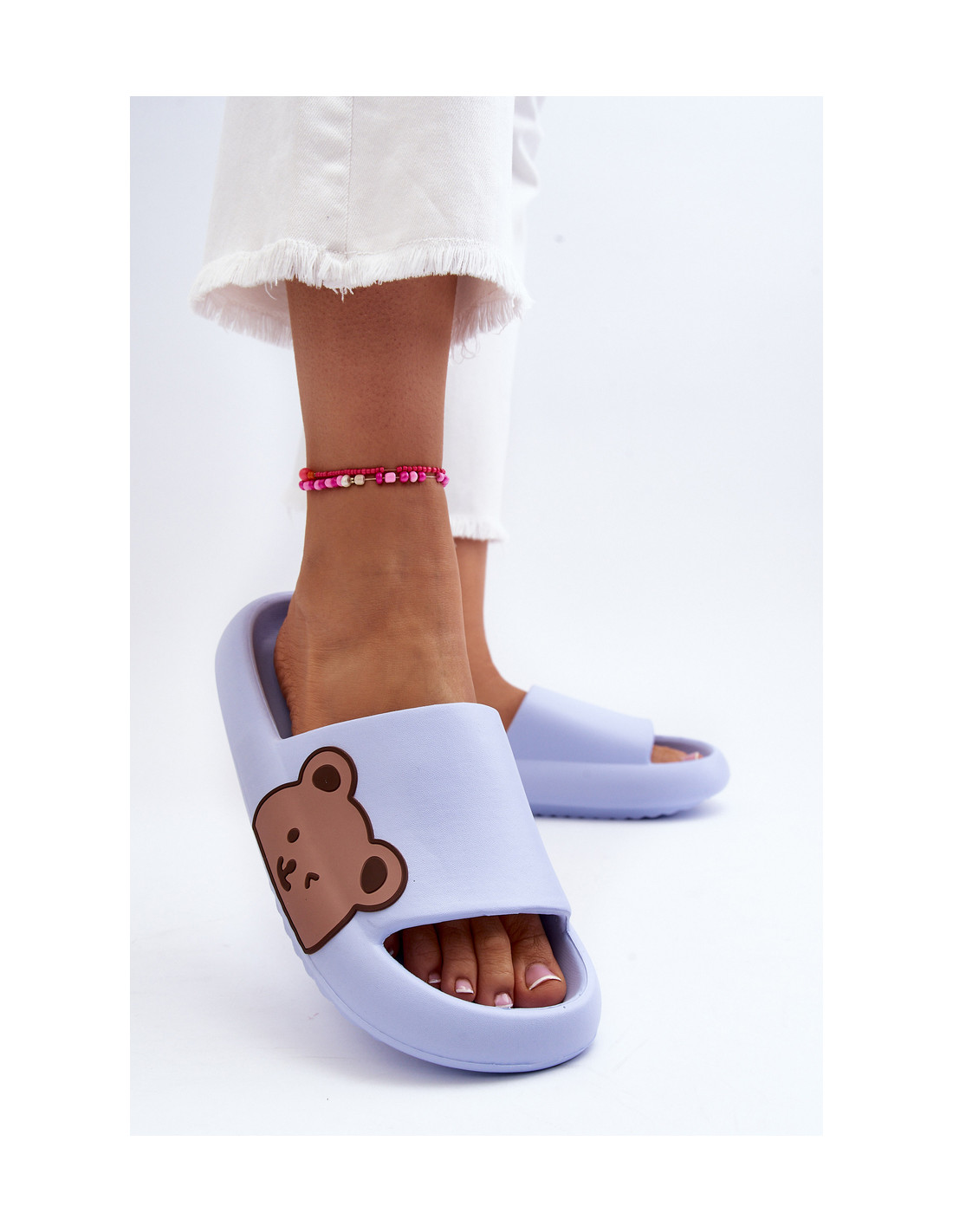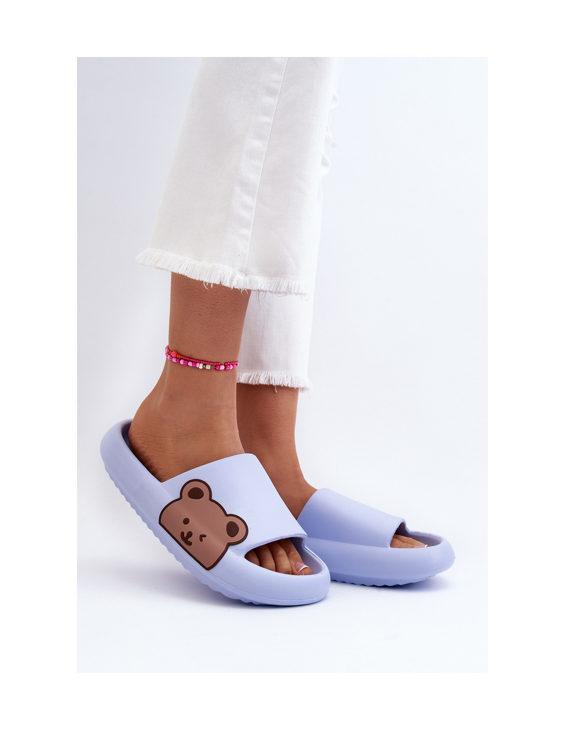 Žavingos moteriškos šlepetės yra pagamintos iš putplasčio medžiagos. Batviršio šone yra mielas meškiuko motyvas. Šis modelis buvo sumontuotas ant masyvios platformos. Taip pat galite juos naudoti kaip kambarinius batus, o ne šlepetes. Šį lengvą modelį itin patogu naudoti. Jūs tikrai turėtumėte juos turėti! Renkantis dydį, vadovaukitės dydžių lentele.