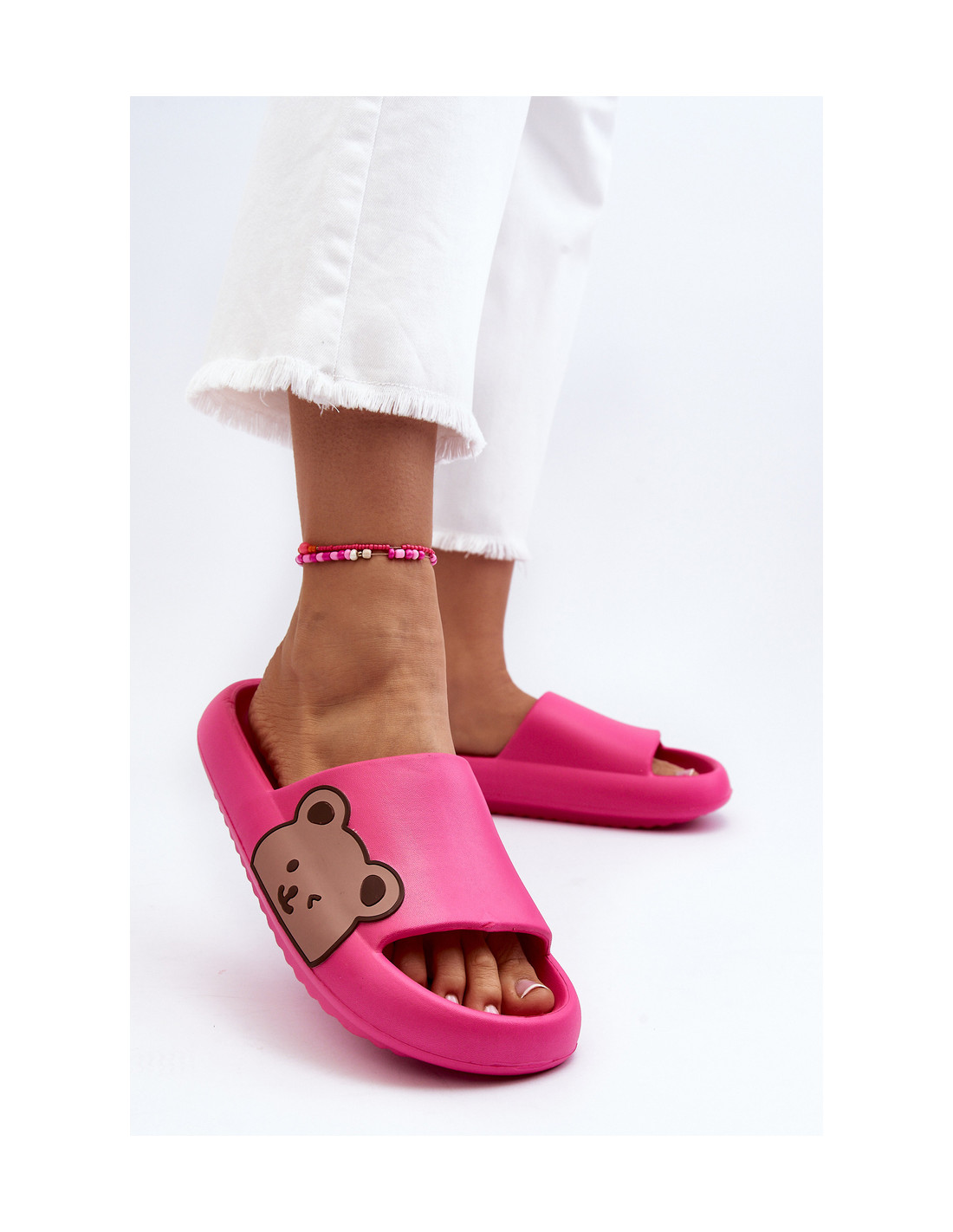 Žavingos moteriškos šlepetės yra pagamintos iš putplasčio medžiagos. Batviršio šone yra mielas meškiuko motyvas. Šis modelis buvo sumontuotas ant masyvios platformos. Taip pat galite juos naudoti kaip kambarinius batus, o ne šlepetes. Šį lengvą modelį itin patogu naudoti. Jūs tikrai turėtumėte juos turėti! Renkantis dydį, vadovaukitės dydžių lentele.