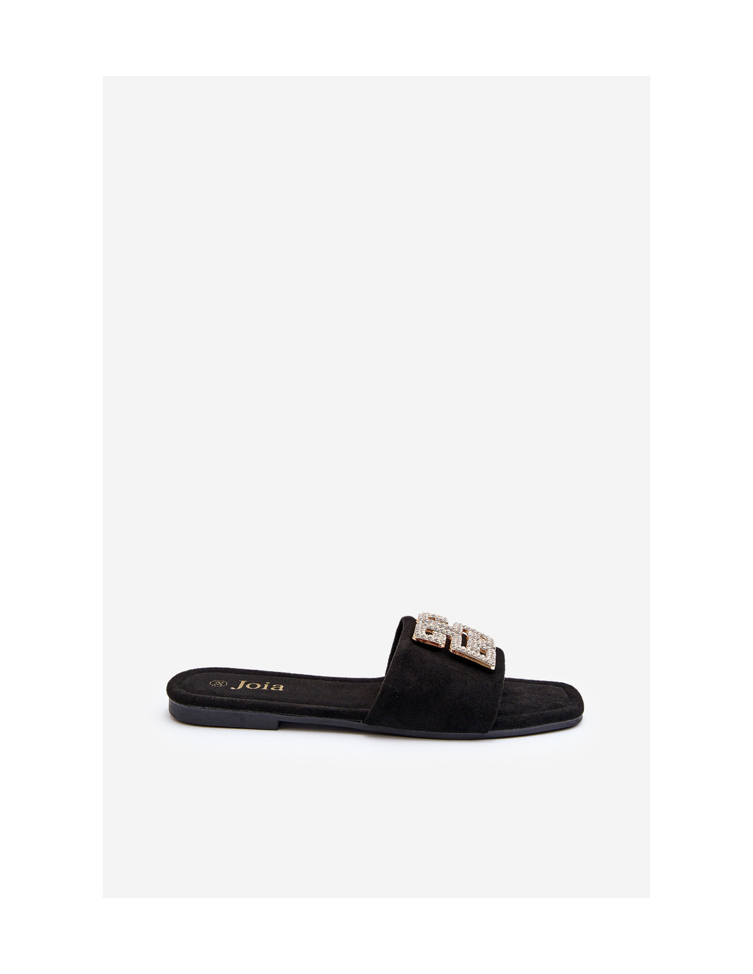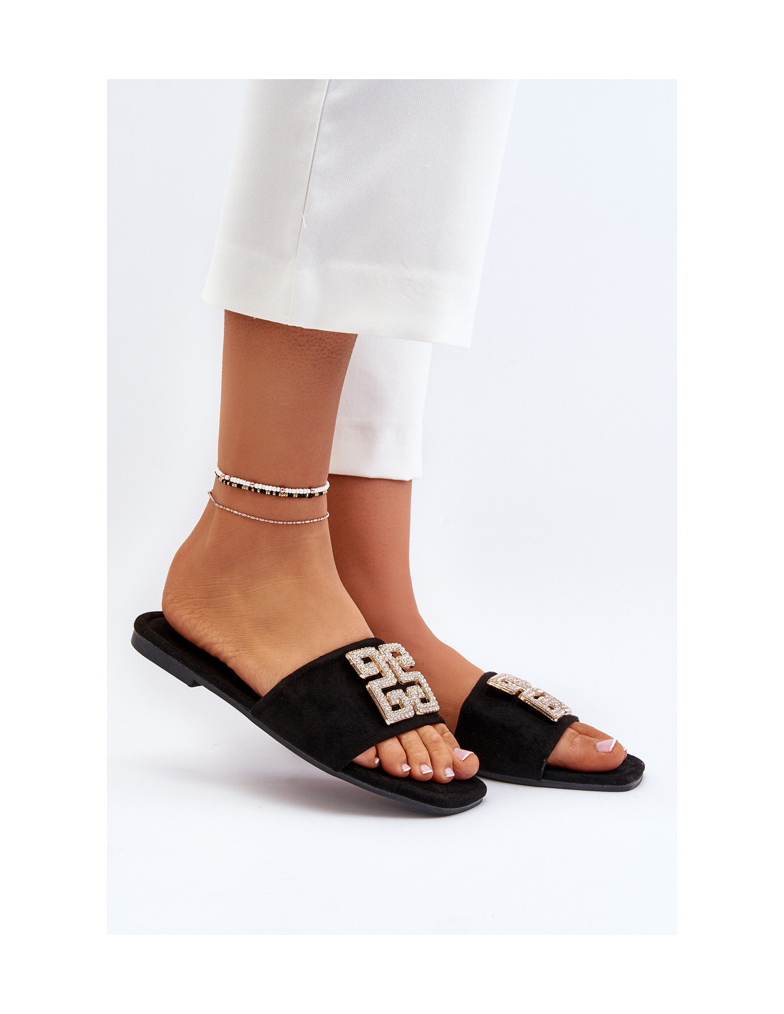 Moteriškos plokščiakulnės šlepetės su puošmena, juodos spalvos inale
