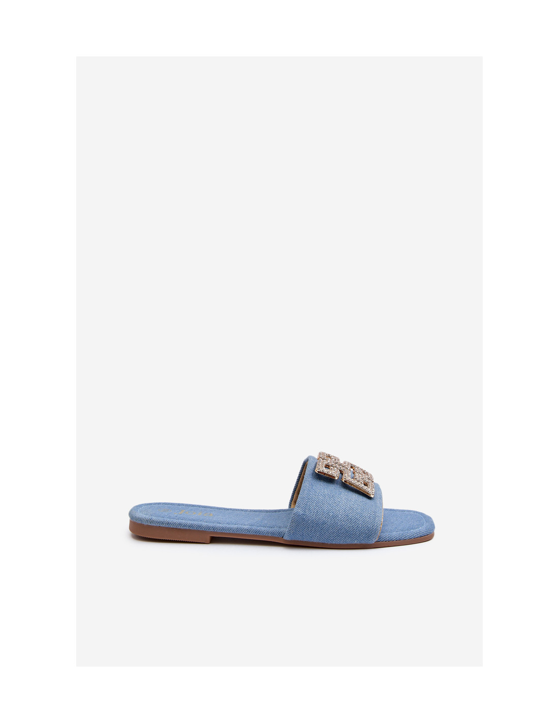 Moteriškos džinsinės šlepetės su plokščiu kulnu ir dekoru, mėlyna inaile