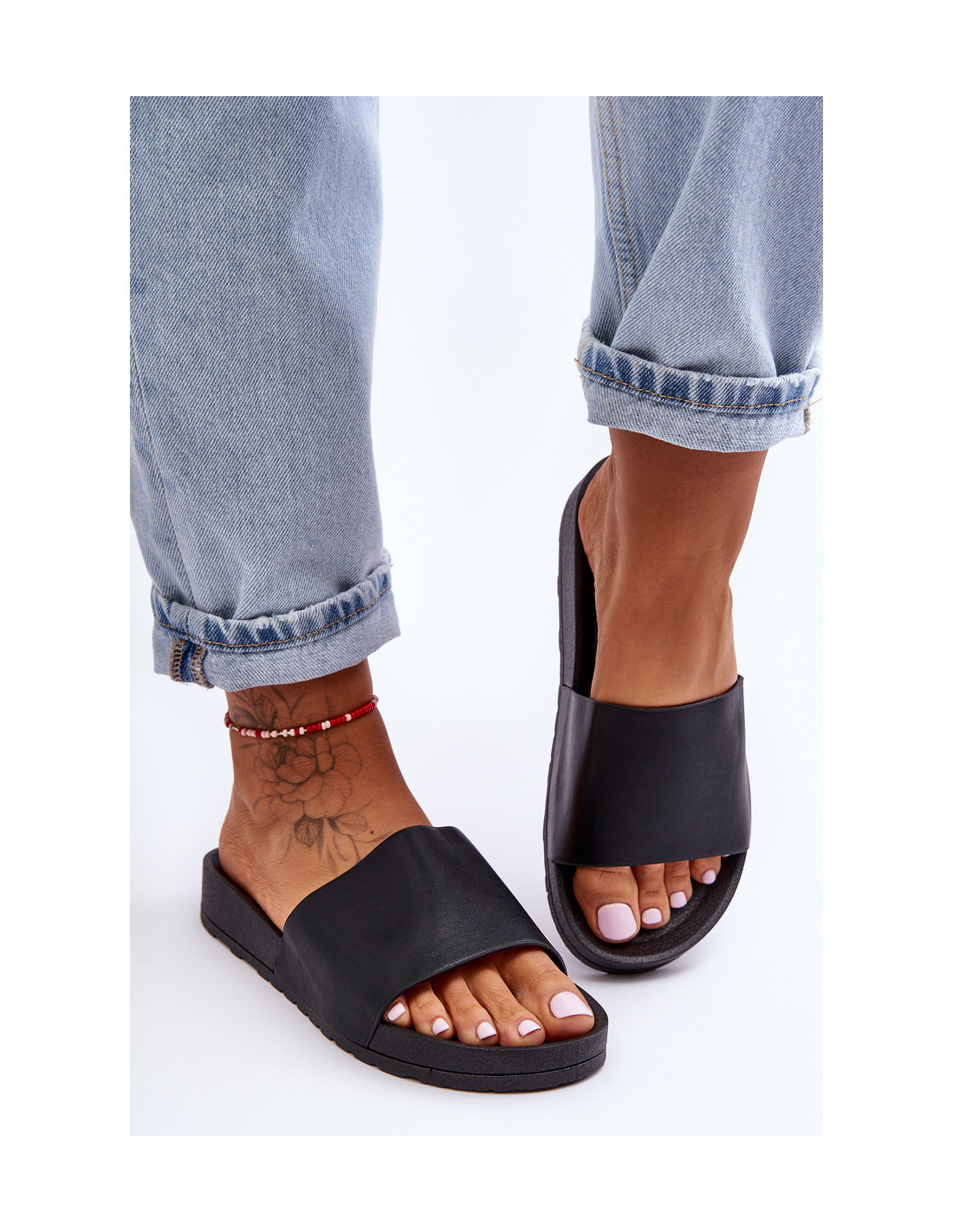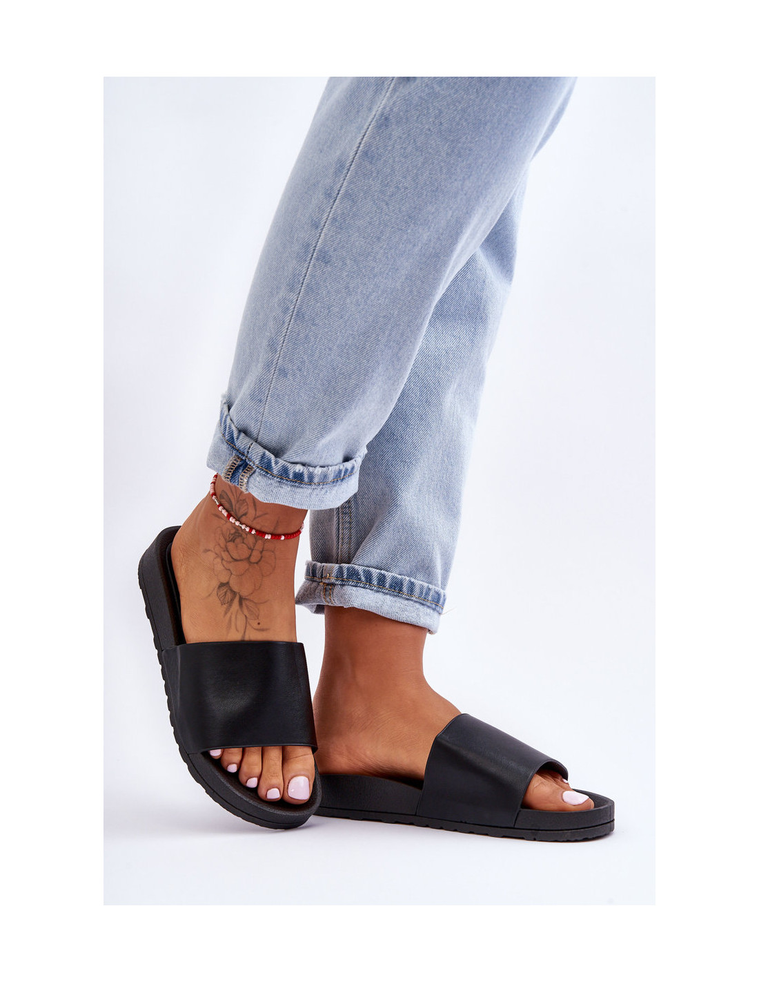 Moteriškos klasikinės šlepetės yra pagamintos iš ekologiškos odos viršaus. Šis modelis sumontuotas ant subtilios guminės platformos. Šios šlepetės puikiai tinka kasdieniam dėvėjimui ir įvairioms progoms, pvz., prie baseino ar paplūdimio. Šį itin lengvą modelį labai patogu naudoti. Renkantis dydį, vadovaukitės dydžių lentele.